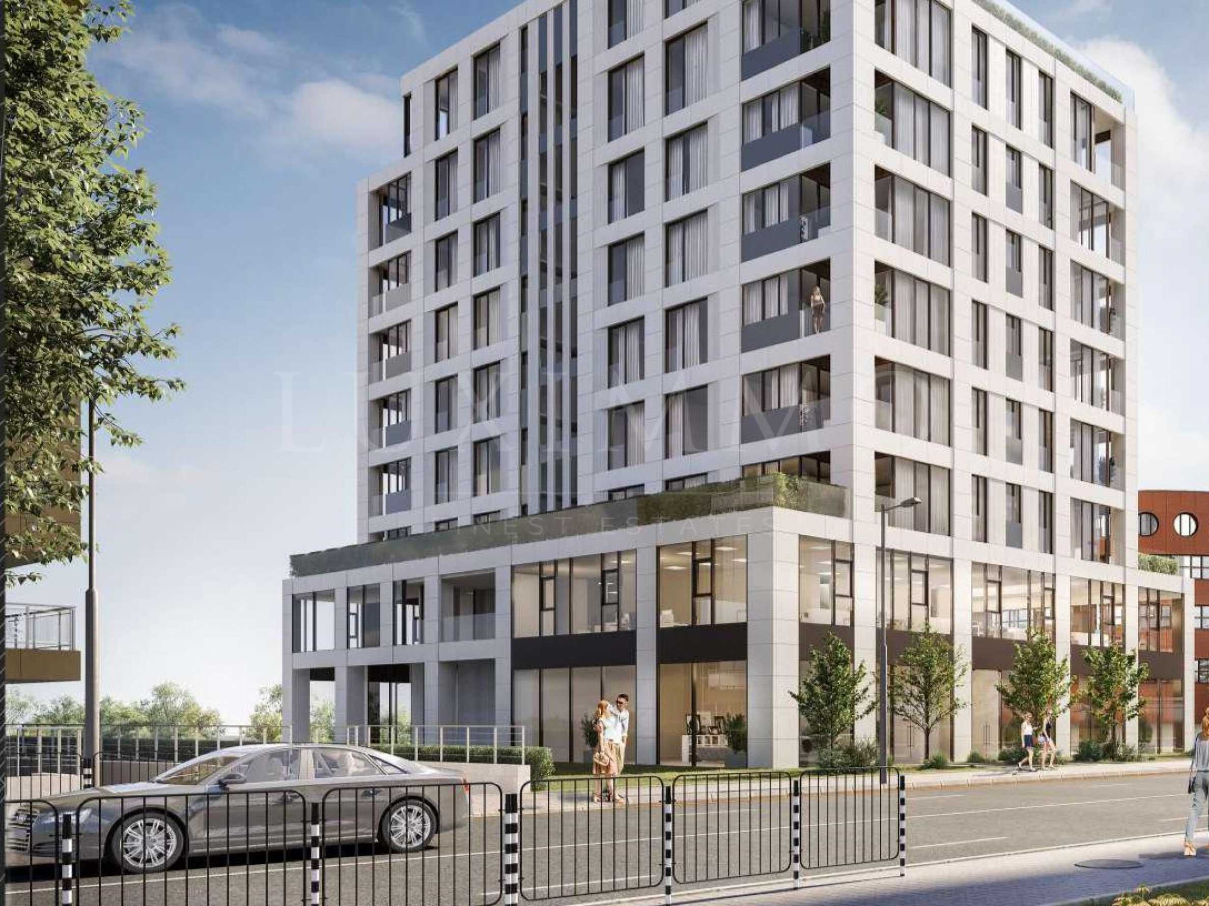 The modern building offers comfortable apartments on 7 floors, a ground floor with commercial properties and two basements with 87 parking spaces.