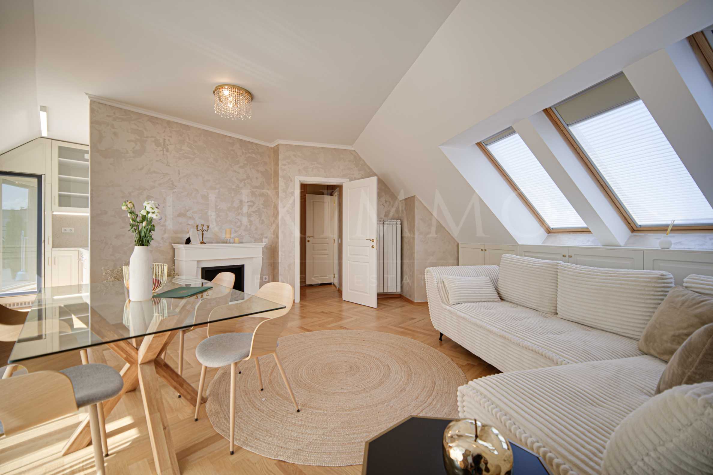 Furnishing: Upholstered furniture; dining table with four chairs; fireplace; built-in kitchen; washing machine with dryer; "Eurolux" refrigerator; oven with "Eurolux" hobs, dishwasher, "Eurolux" washing machine; beds with mattresses; built-in wardrobes and cabinets; desks; blinds; garden furniture; sun loungers, etc.
