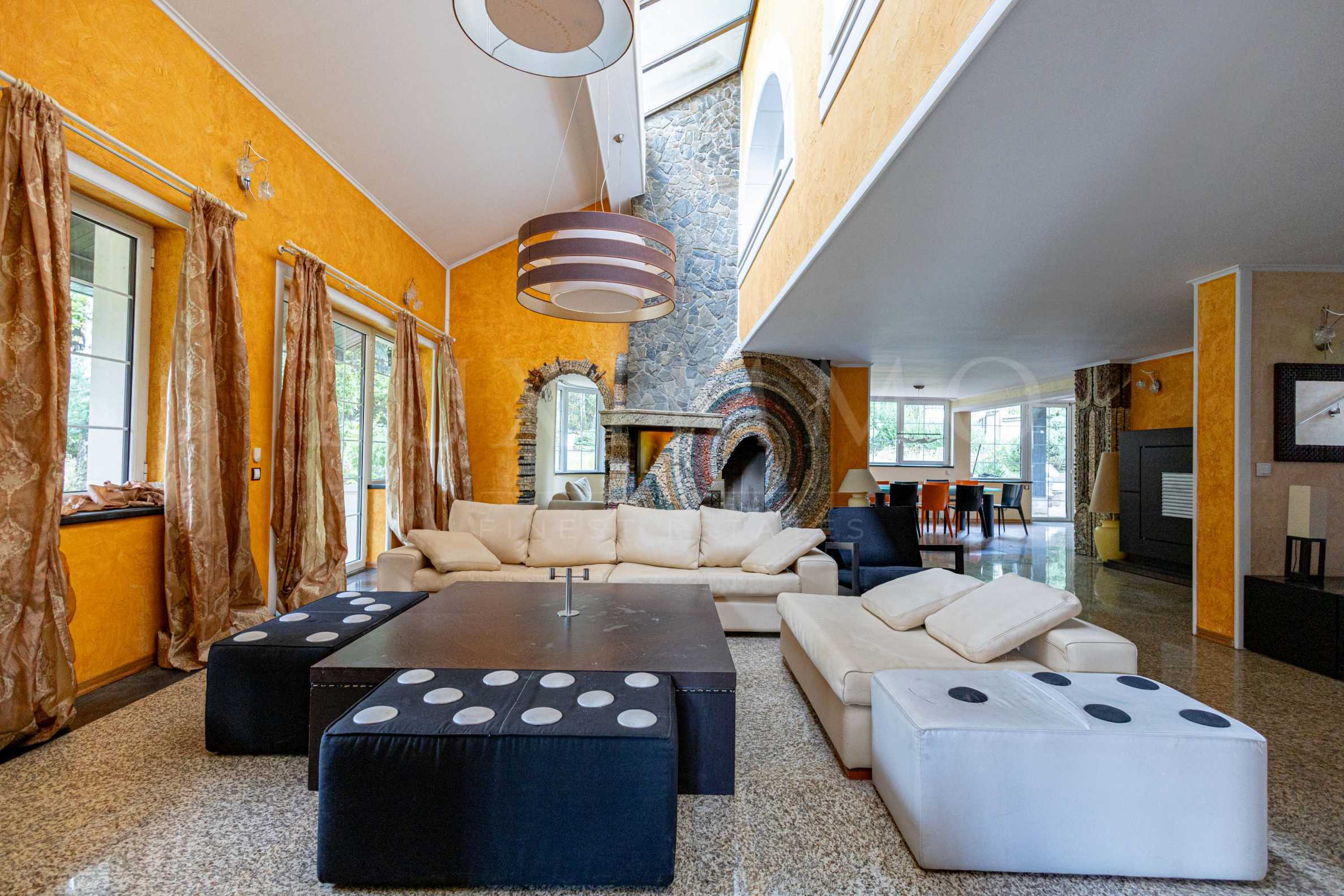 The house is a solid construction, with high-quality finishing works and artistic panels of natural stone. It needs refreshing renovation and is offered semi-furnished.