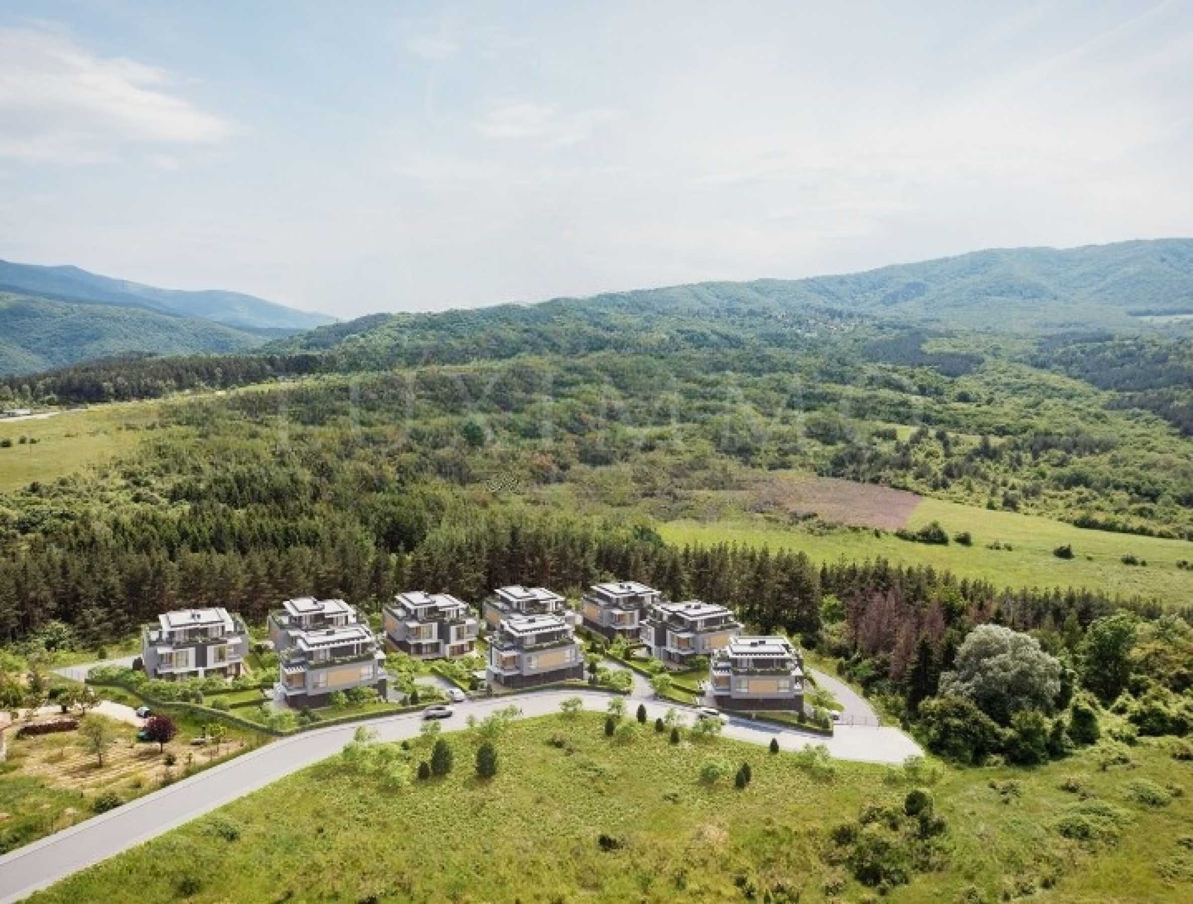We present a first-class semi-detached house for sale in a new complex with modern architecture, high-class materials and impressive panoramic mountain views. Located in one of the cleanest, most peaceful and prestigious locations in Sofia — the villa area of Gorna Banya — the project offers uncompromising quality, privacy and living in nature minutes from the city.