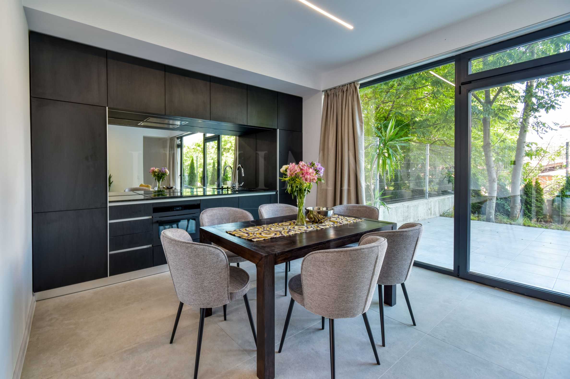 The kitchen is fully equipped with high-end AEG appliances – induction hob, combined oven with microwave, dishwasher, fridge with freezer and BOSCH gas boiler, and in the technical room there is an AEG washing machine. The spacious living area with kitchen and dining room provides light and comfort, and the direct access to its own landscaped yard with automatic irrigation system creates the feeling of a house with a garden in the city. The bedrooms are bright and furnished with attention to detail, providing comfort and tranquility.