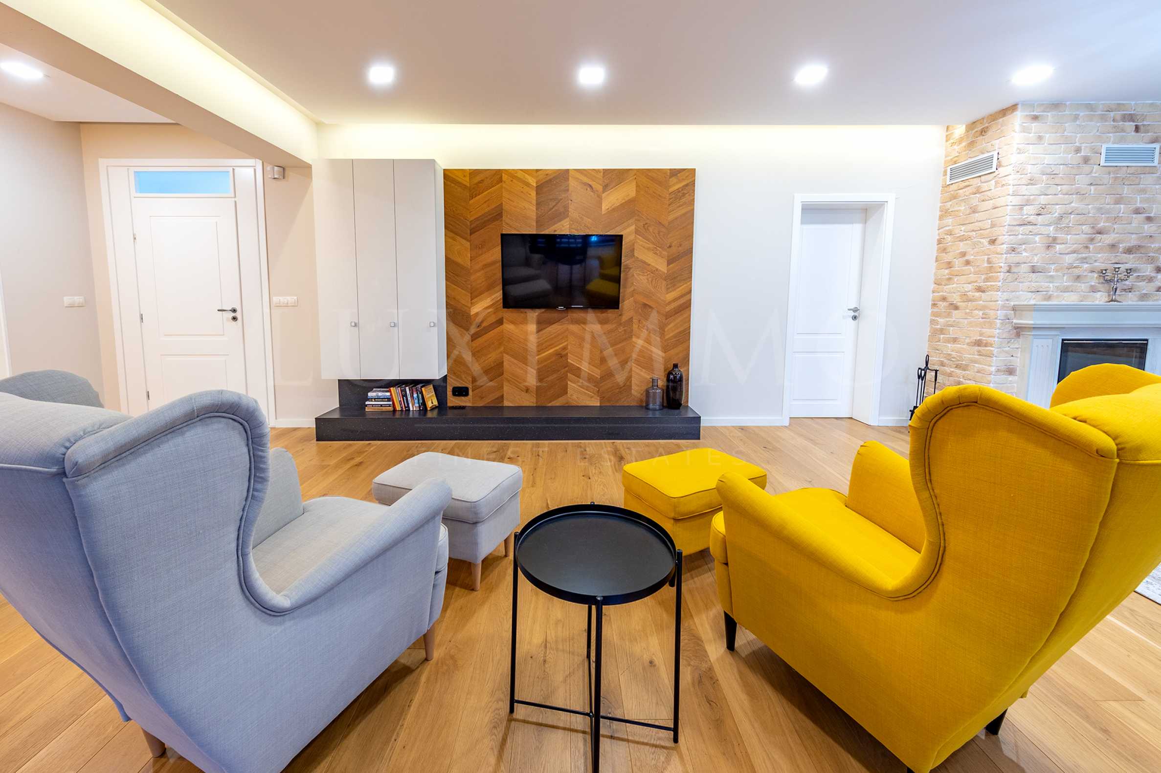 - stylish TV corner with armchairs and a solid wooden TV wall;