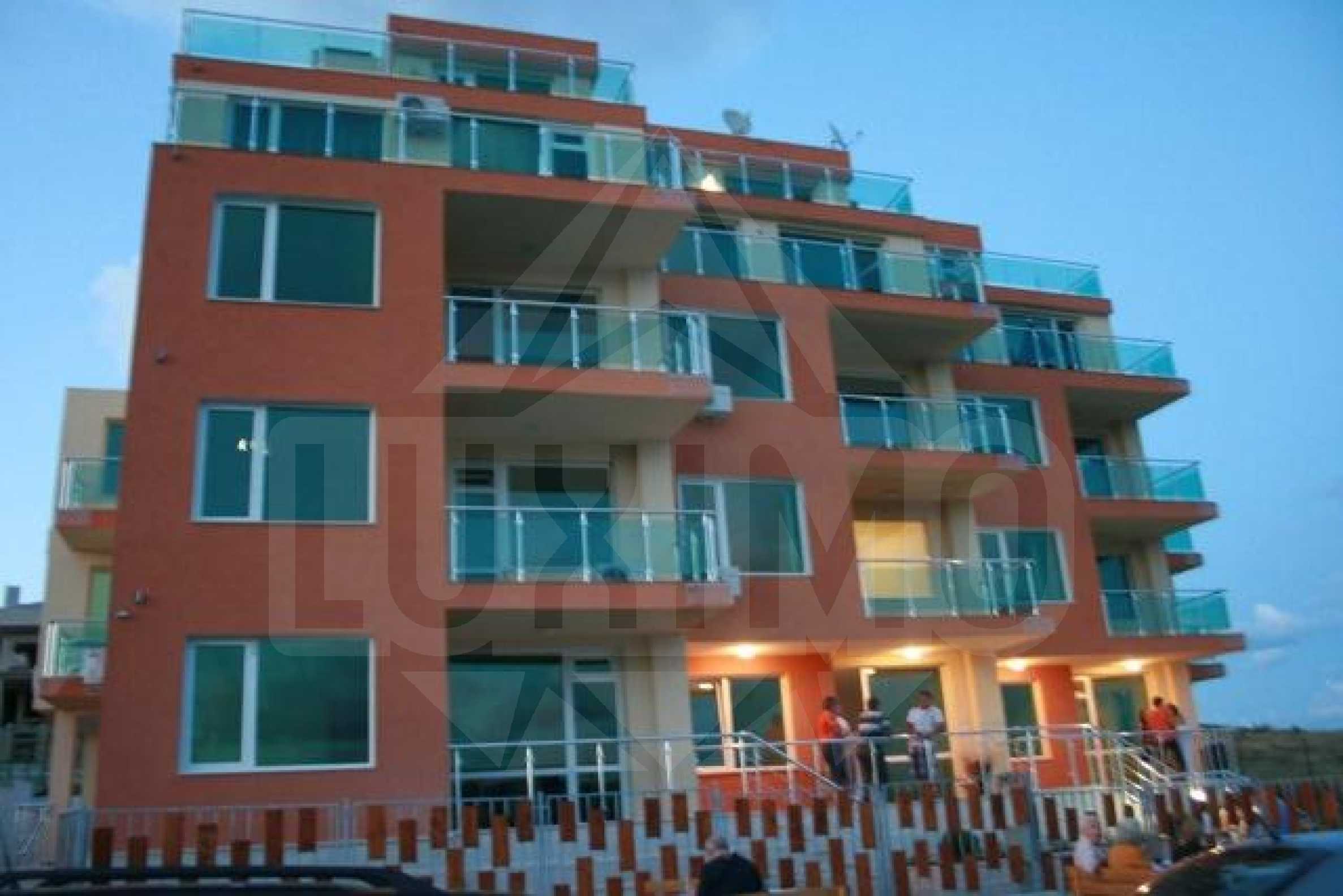 This 2-bedroom apartment is located on the third residential floor. On an area of 111.52 sq.m are distributed 2 bedrooms, a living room with an open plan kitchen and a large sea view terrace. The whole apartment is exposed to the sea and is very spacious. The apartment is luxuriously finished with a kitchen, bathroom, painted walls and ceilings and laminated floors. There are also cable TV, Internet and telephone points. The common areas in the resort include a swimming pools, a reception, a playground for children and parking spots and twenty-four-hour security. Apartment maintenance and management will also be available.