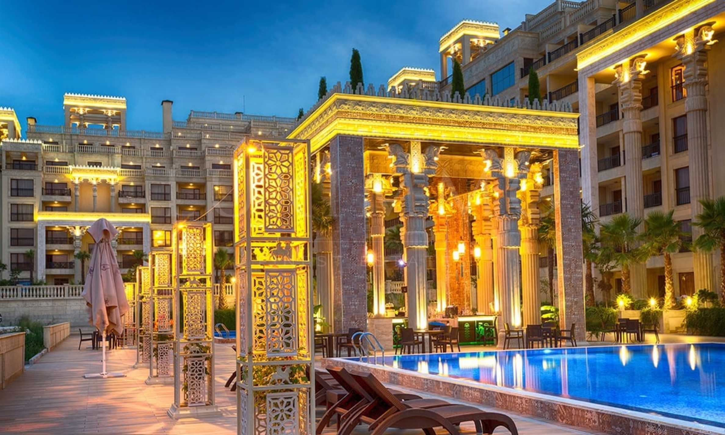 The complex is built in a unique style, richly decorated with ornaments and statues on the facades and columns. It is one of the newest and most luxurious apart-hotels in the Golden Sands resort. For the residents of the building there are four outdoor swimming pools, gym, restaurant, bar, underground and aboveground parking, playground and a huge well-landscaped and maintained area.