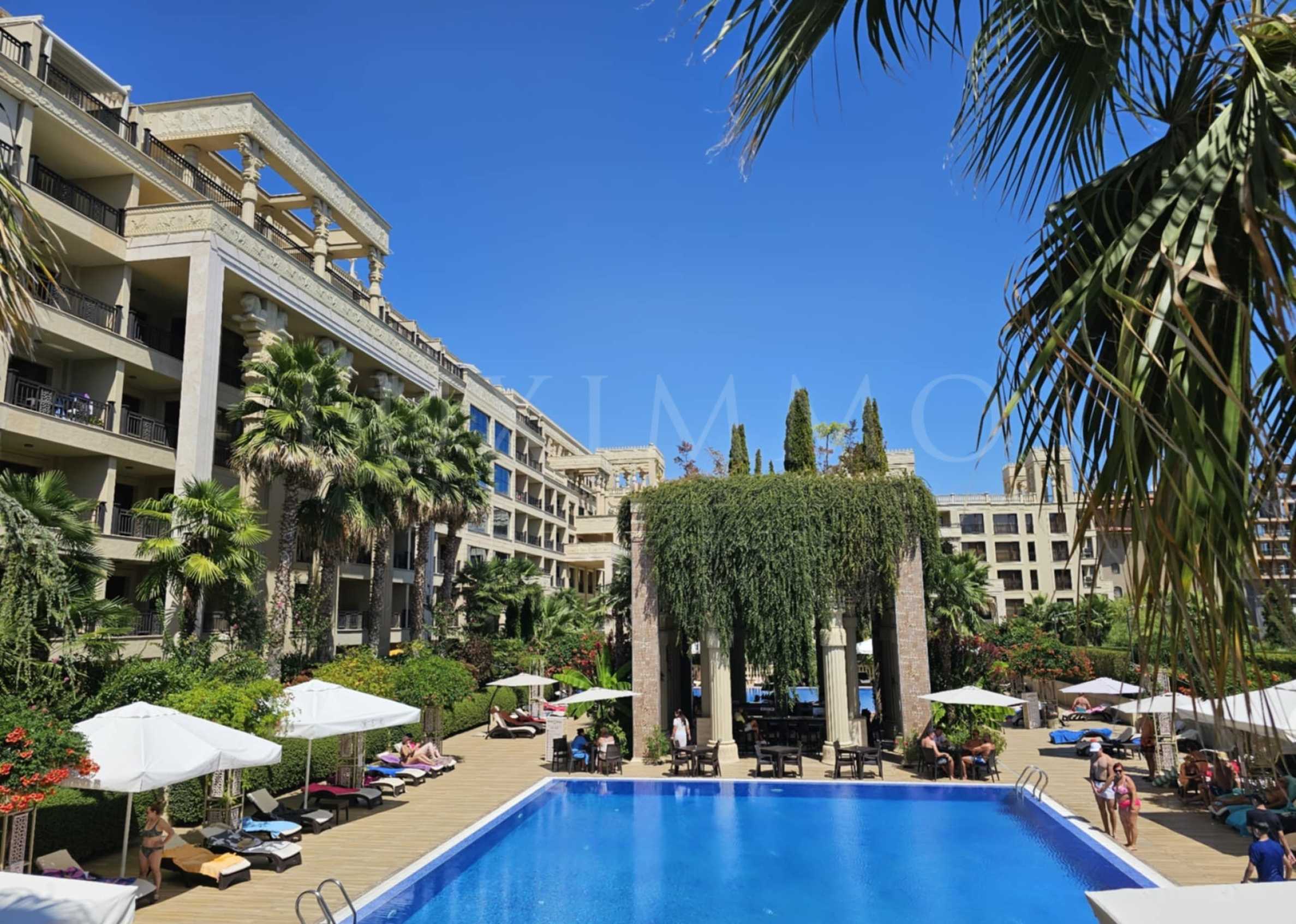 The complex is built in a unique style, richly decorated with ornaments and statues on the facades and columns. It is one of the newest and most luxurious apart-hotels in the Golden Sands resort. For the residents of the building there are four outdoor swimming pools, a gym, a restaurant, a bar, underground and above-ground parking, a children's playground, as well as a huge well-landscaped and maintained territory.