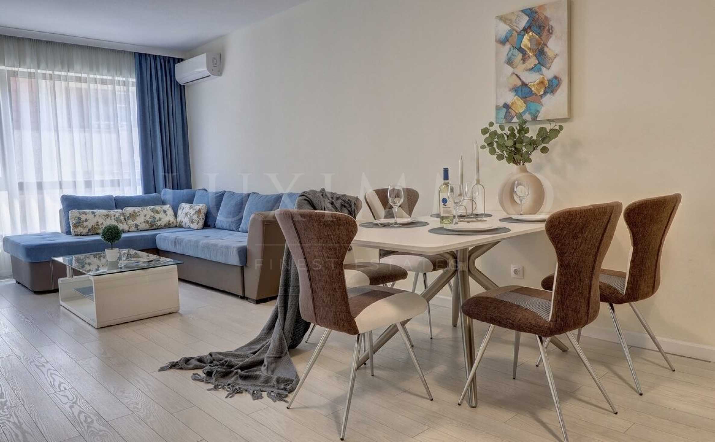 We present a new, first-class furnished two-room apartment for rent - Grand Blue. The property is located on the 2nd residential floor of a new, elegant building, in the center of the city of Varna.