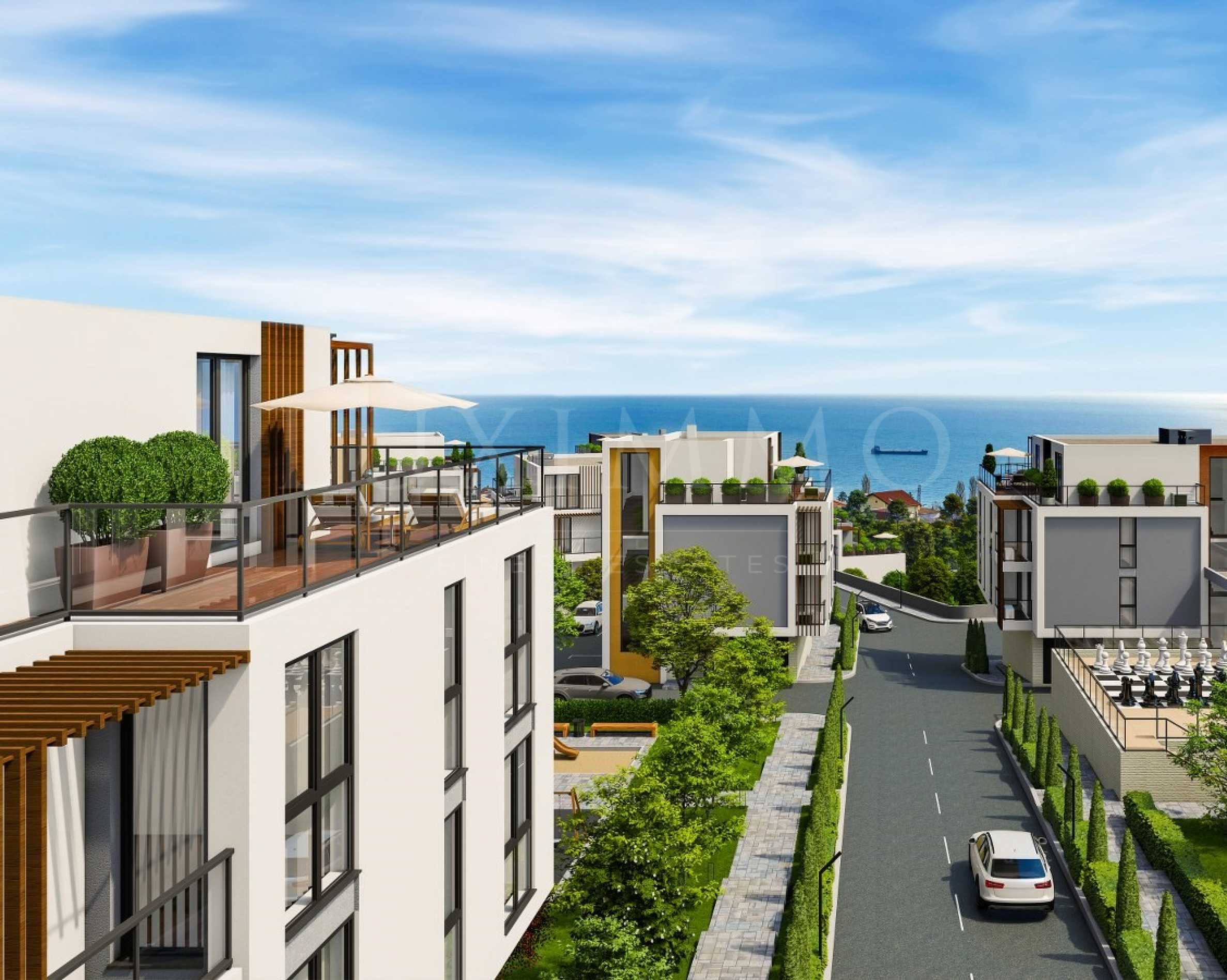 With a view of the sea and the horizon, among over 60 types of park seasonal and year-round vegetation, promenades for walking and entertainment, in harmony with the internal infrastructure of the complex and synergistically with the architectural solution, the "Trade and Business Center" and 10 residential buildings are located - from 4 to 7 floors. Intertwined with the park environment, the internal transport infrastructure is also developed through roundabouts, with a fast and safe connection to the transport scheme of the city of Varna.