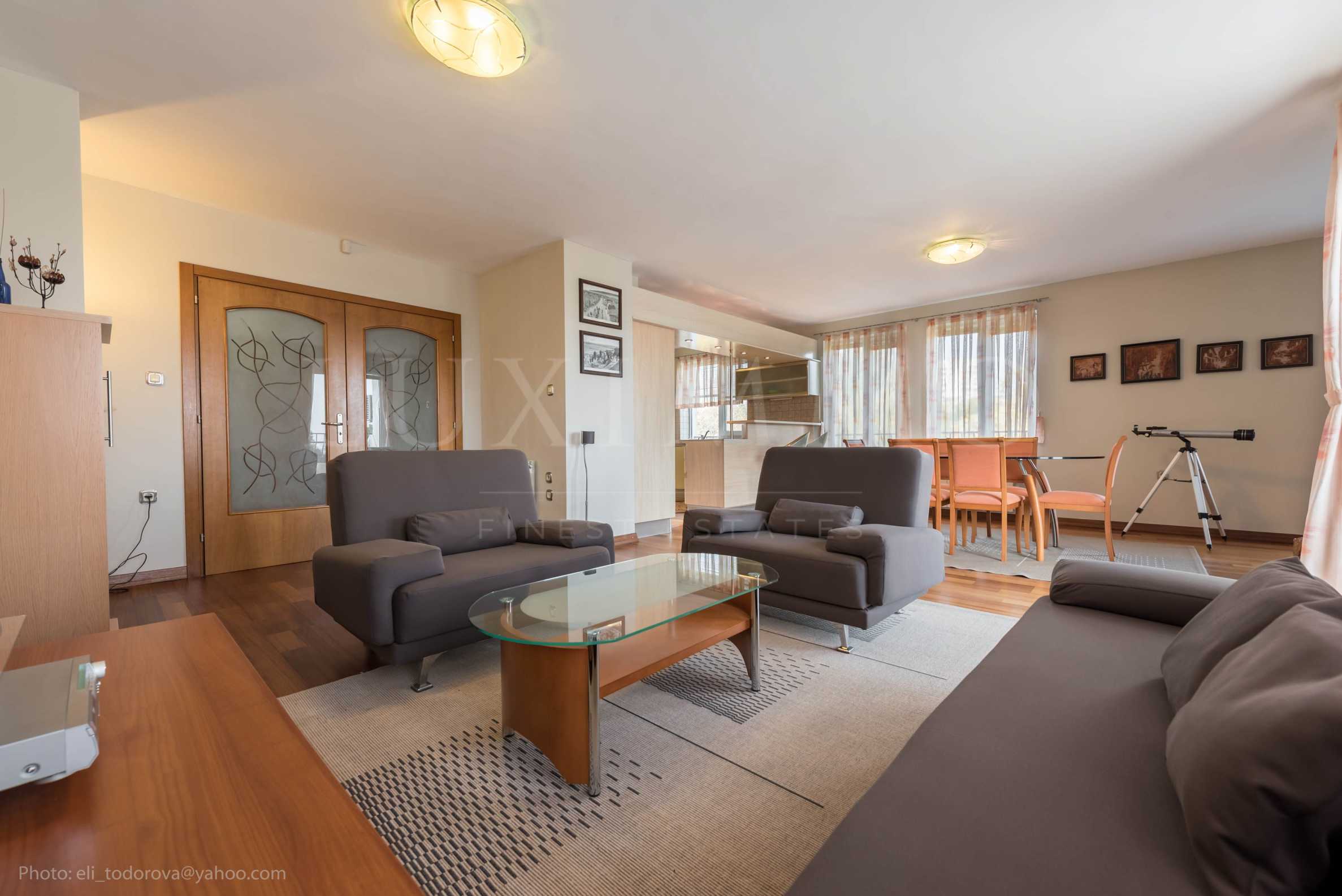 The property is south-east facing. It consists of entrance hall, living room with kitchenette and terrace, two bedrooms with terrace, toilet, bathroom with toilet. The area of the apartment is 124 sq. m. Year of construction: 1999. The apartment is in excellent condition, fully furnished with quality equipment. Heating is via air conditioning and central heating. Flooring - laminate flooring in the living room and parquet floors in the bedrooms. The property is supplied with electricity, water and sanitation. The building has an elevator.