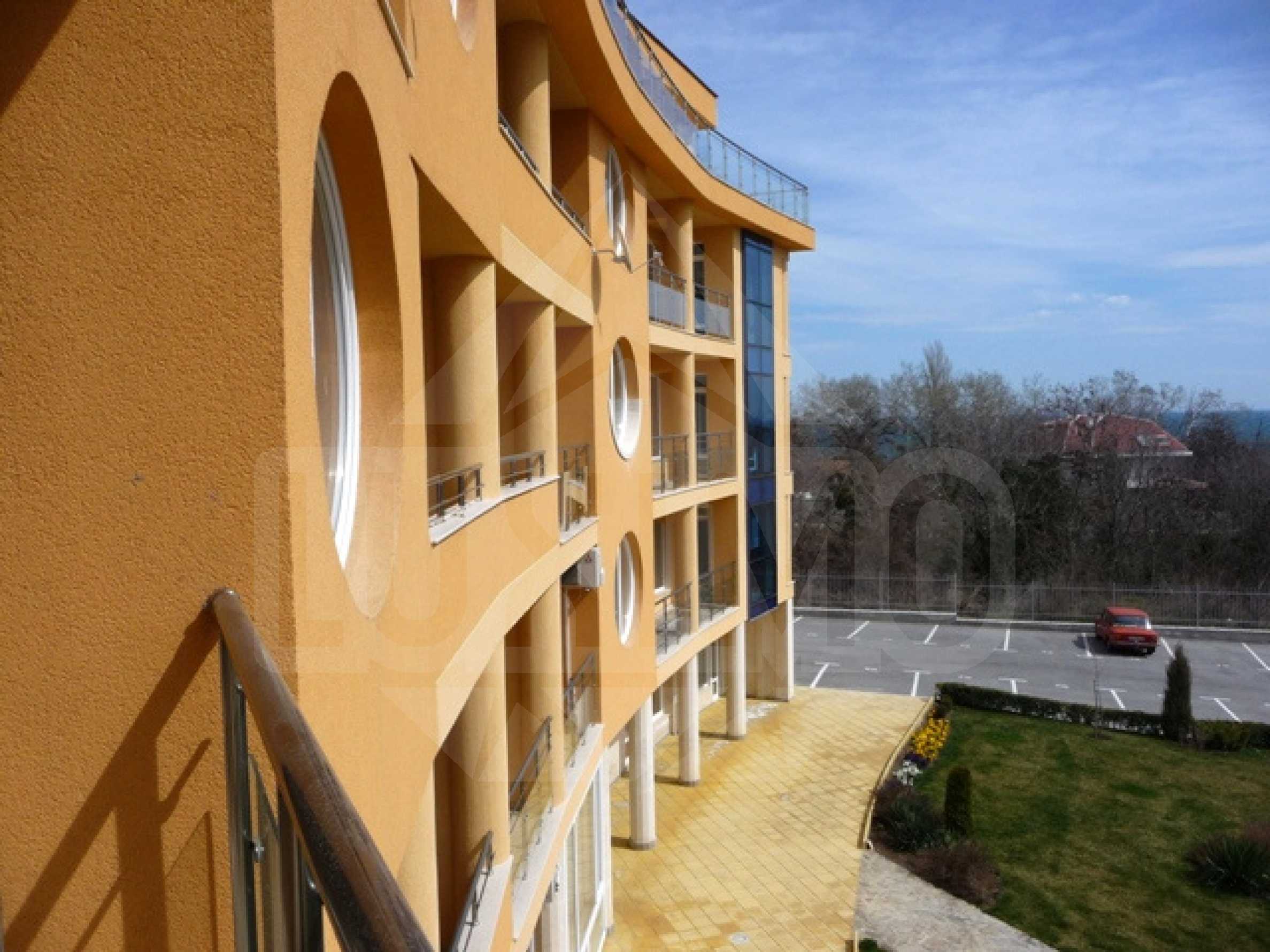 This stylish apartment is peacefully nesting in one of the most beautiful and unique buildings in Varna surrounded by greenery and tranquility. Located just 50 m away from the closest beach, this residential building benefits greatly from its large and excellently landscaped private garden, which has turned into a natural continuation of the Sea Garden itself. What is more, the commercial “heart” of Varna city is accessible on foot and you could easily get there while walking through the alleys of the Sea Garden or by the sea.