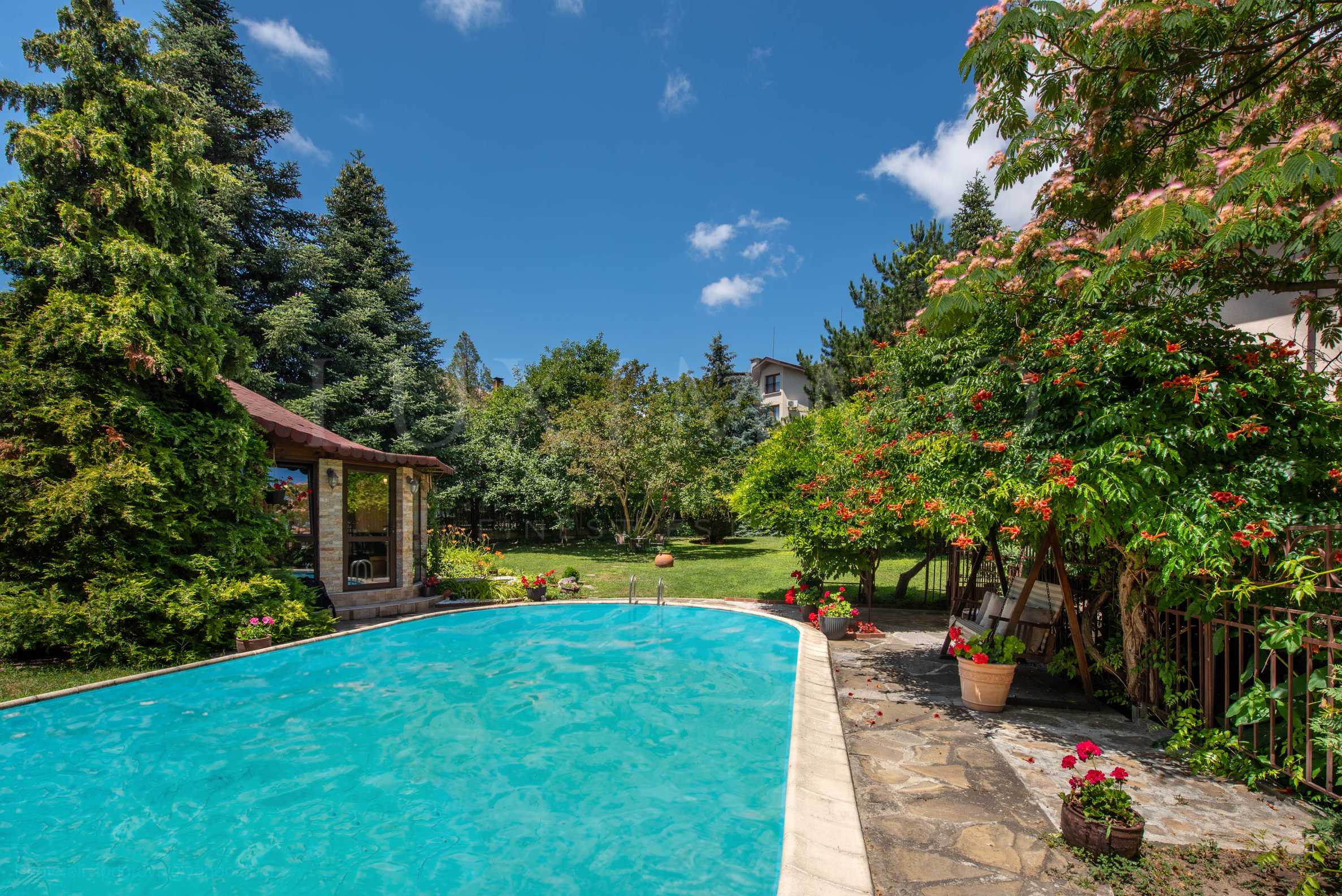 The house with a total area of 548 sq.m has a yard of 1077 sq.m, a swimming pool, a large garden and its own greenhouse. It has all communications such as sewage, electricity and mains water supply.