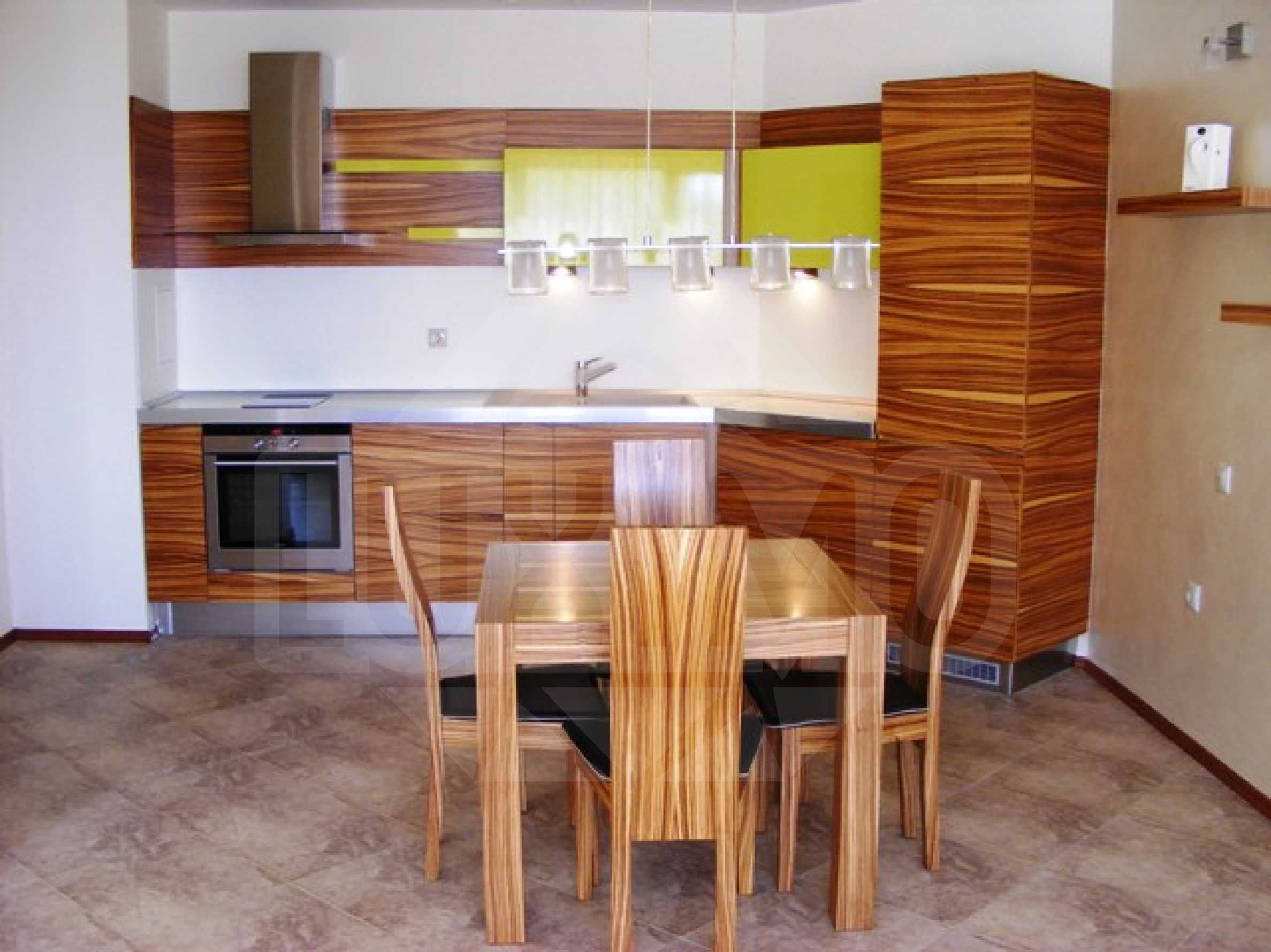 On total area of 65 sq.m are situated in a common room: kitchenette, dining and living part and bedroom with large wardrobe and separate entrance, bathroom with toilet and terrace. The windows throughout the apartment are of french type with German PVC joinery, making the premises very bright and cozy.