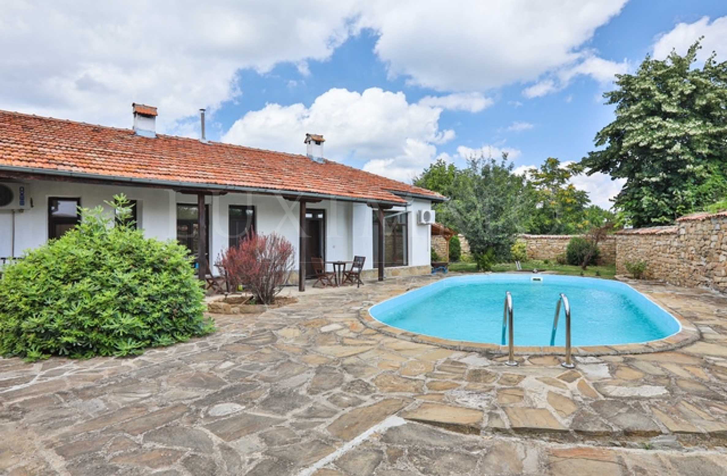 The yard is 1,000 m2. well maintained, surrounded by a stone fence. It has a summer kitchen and a swimming pool.
