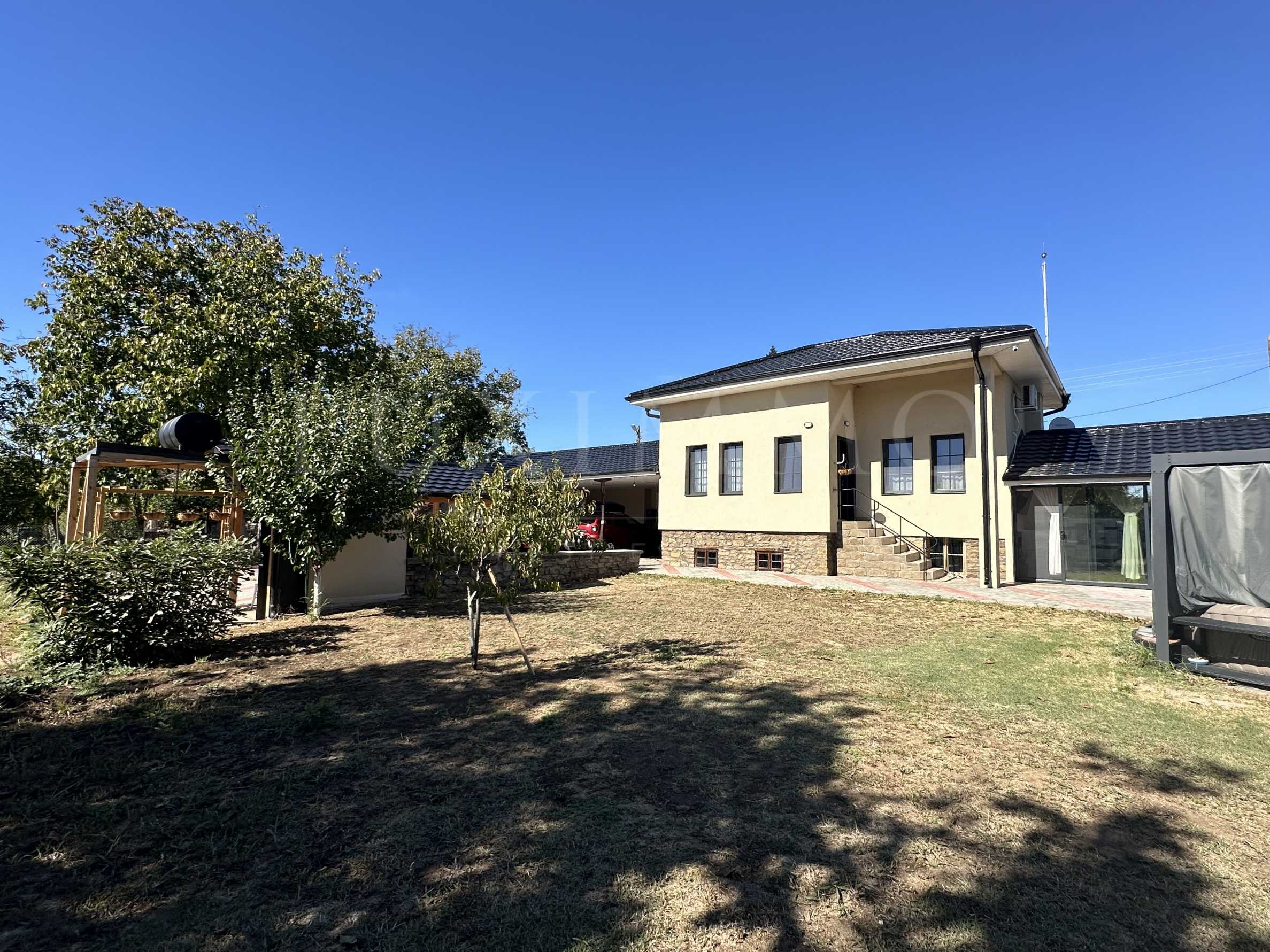 Additional amenities include an outdoor bathroom with toilet, a spacious carport for several cars, as well as an outdoor jacuzzi. The yard is partially paved and is surrounded by natural beauty, including two large walnut trees providing shade during the hot summer days. The property is fully furnished with taste and attention to detail.
