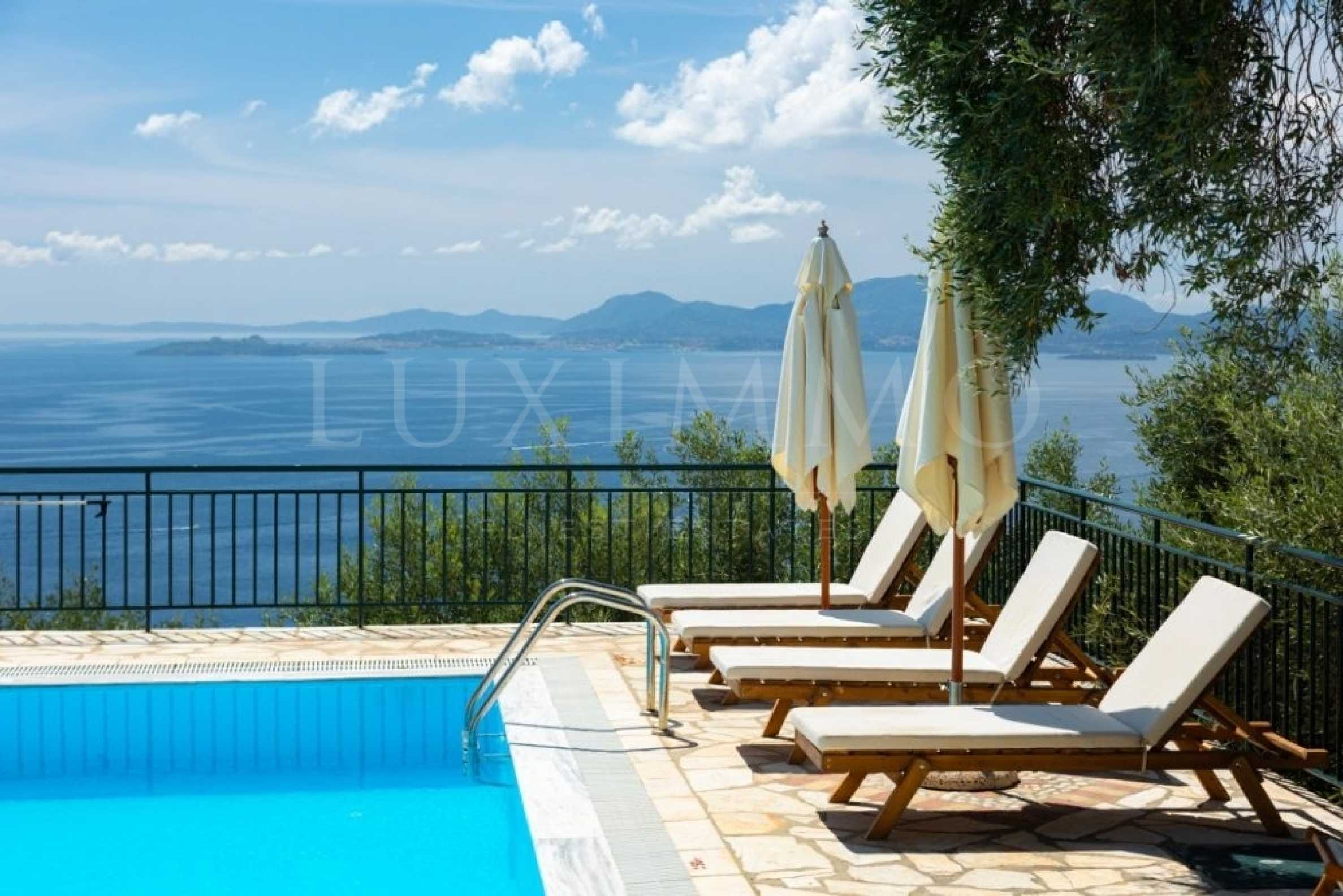 This property was constructed with taste and love. It lies on a hillside on the east coast of Corfu Island. surrounded by beautiful gardens with colorful flowers, lash vegetation and trees.