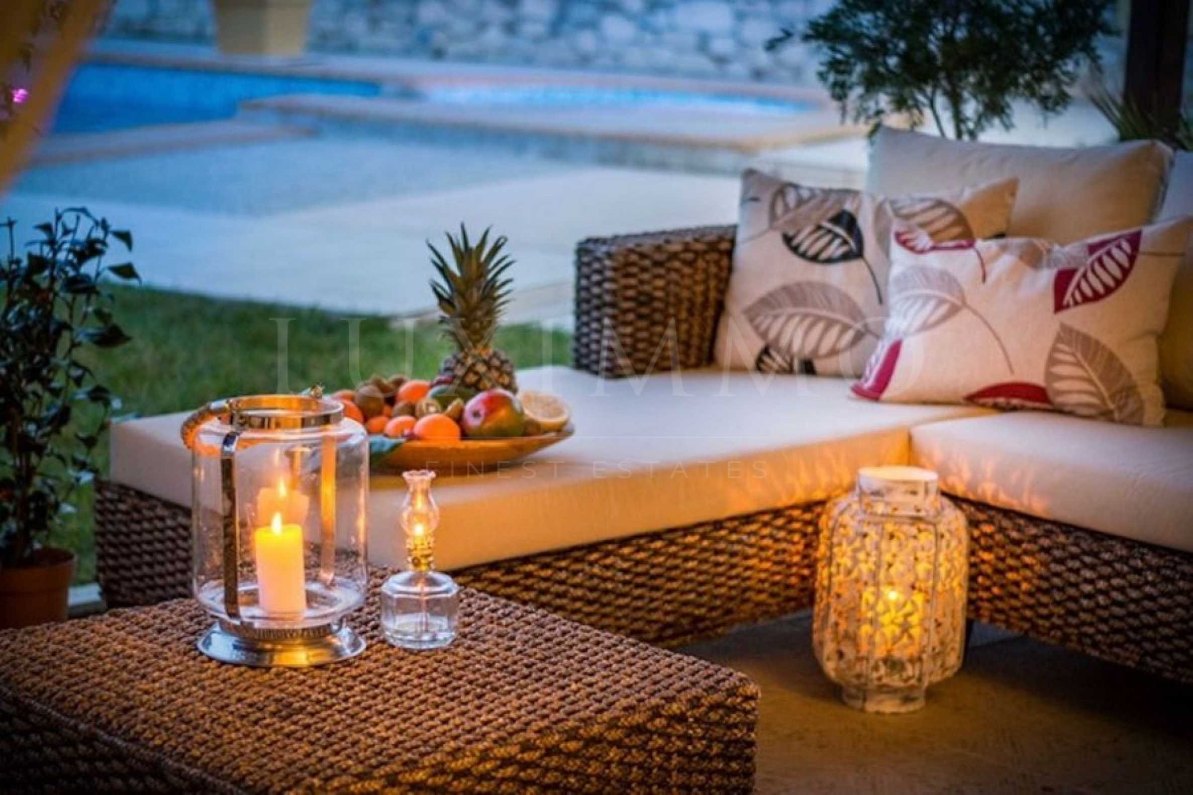 Three-storey detached house, in a residential complex, in Kassandra, Halkidiki, with private pool and magical sea. The property is surrounded by an acre of garden, it was built in 2010 and the renovation took place in 2019. On the ground floor there is the living room connected with the dining room and the kitchen and a wc. On the first floor there are two bedrooms with shared bathroom and on the second floor there is a master bedroom 35 m². The house has big balconies, wooden joinery, kiosk, barbecue, security door, fitted closet and kitchen.