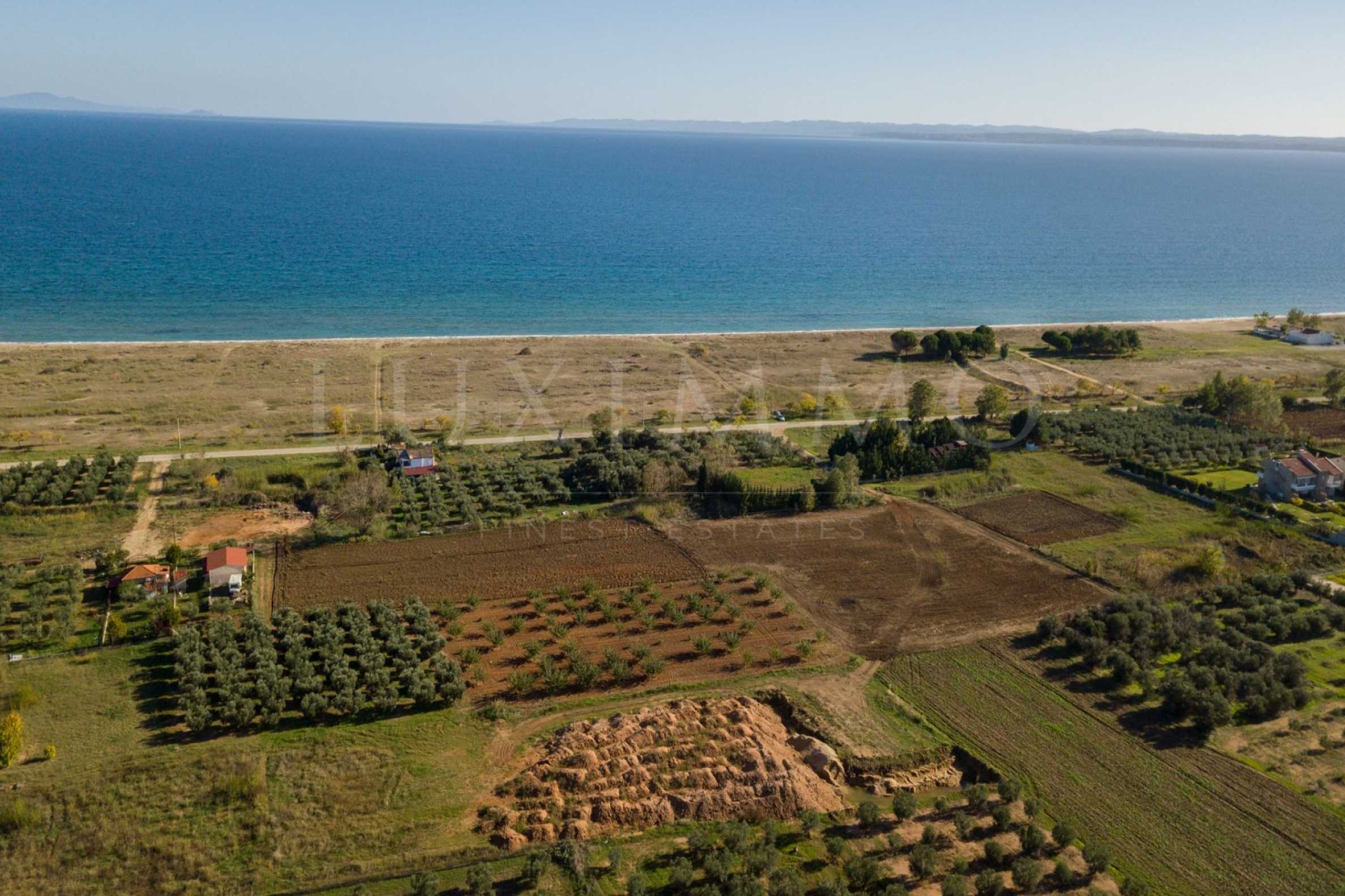 Flat field, 5800 m², in Kassandra,Halkidiki with unobstructed permanent view and with a southeastern orientation.The property is 50 m. away from the beach and a complex of houses.The field is complete and buildable(200 m² can be built).The property is perfect for the construction of a villa.