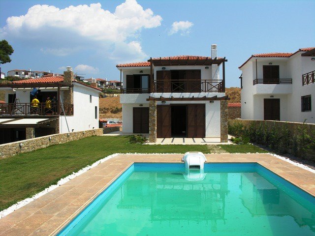 Two storey, new built, luxurious villa in Kassandra, Halkidiki, 150 m2, with large garden, gorgeous sea view and private external pool. It has two parking spots. The villa has three bedrooms with separated bathroom and a cozy living room with a fire place.