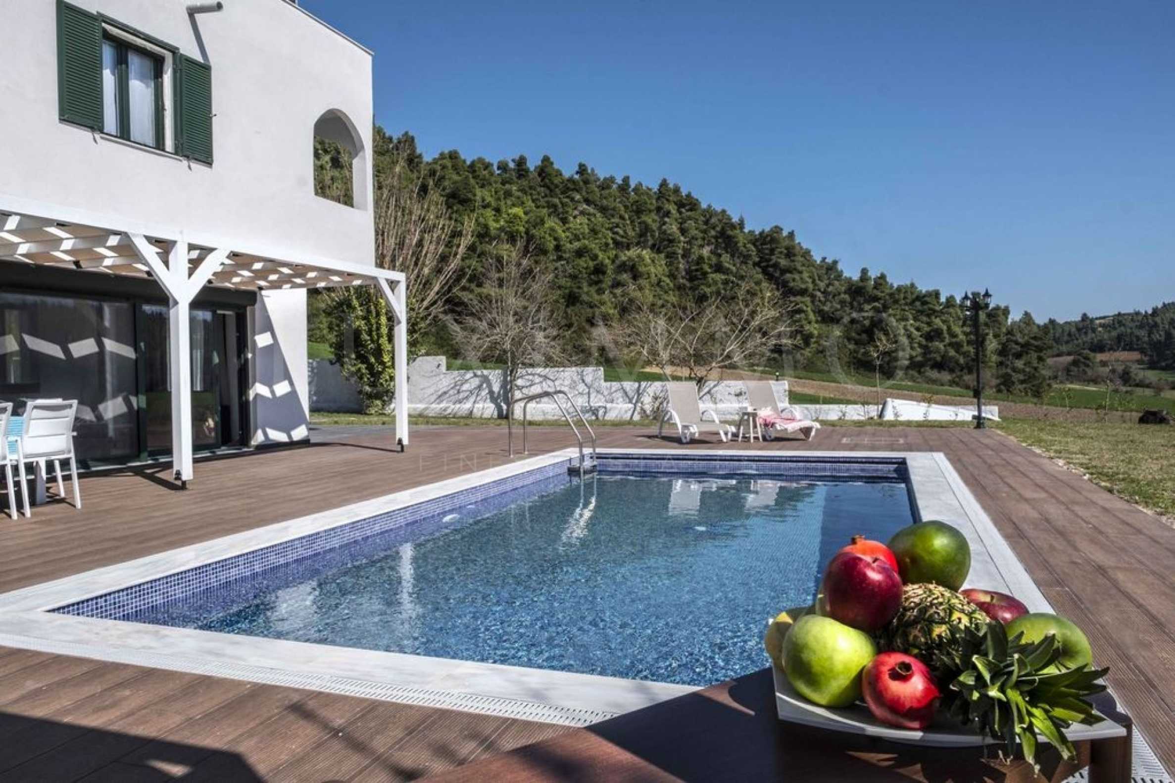 Luxurious villa,220 m², in Kassandra, Halkidiki, in a pine-covered area and five minutes away from the beach. It is split in two levels, consisted of a living room connected with the kitchen, four bedrooms, three bathrooms and a storage room. It has 5.000 m² garden with automated watering, aluminum joinery, boiler, kiosk, outdoor pool and satellite antenna. The property is perfect for an investment and is fully furnished.