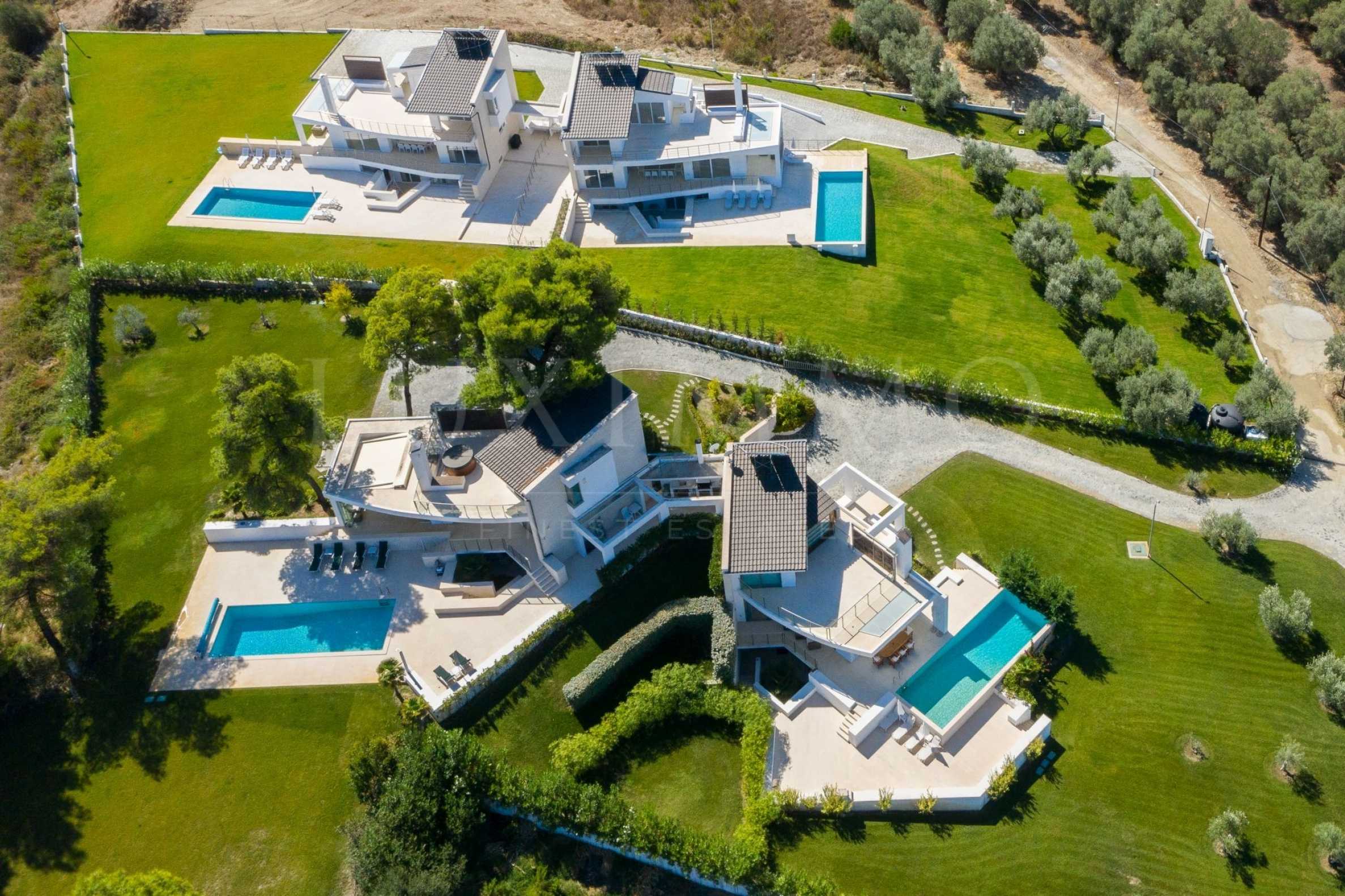 Newly - built complex of 4 luxurious villas in Kassandra, Halkidiki, with a wonderful view of the Toronaios bay. The complex is consisted of 4 living rooms connected with the dining rooms with a kitchen, 19 bedrooms, 14 bathrooms, 4 wc and 4 storage rooms. The plot is 8 acres and each villa has a private pool and three parking spaces. It is perfect for professional exploitation.