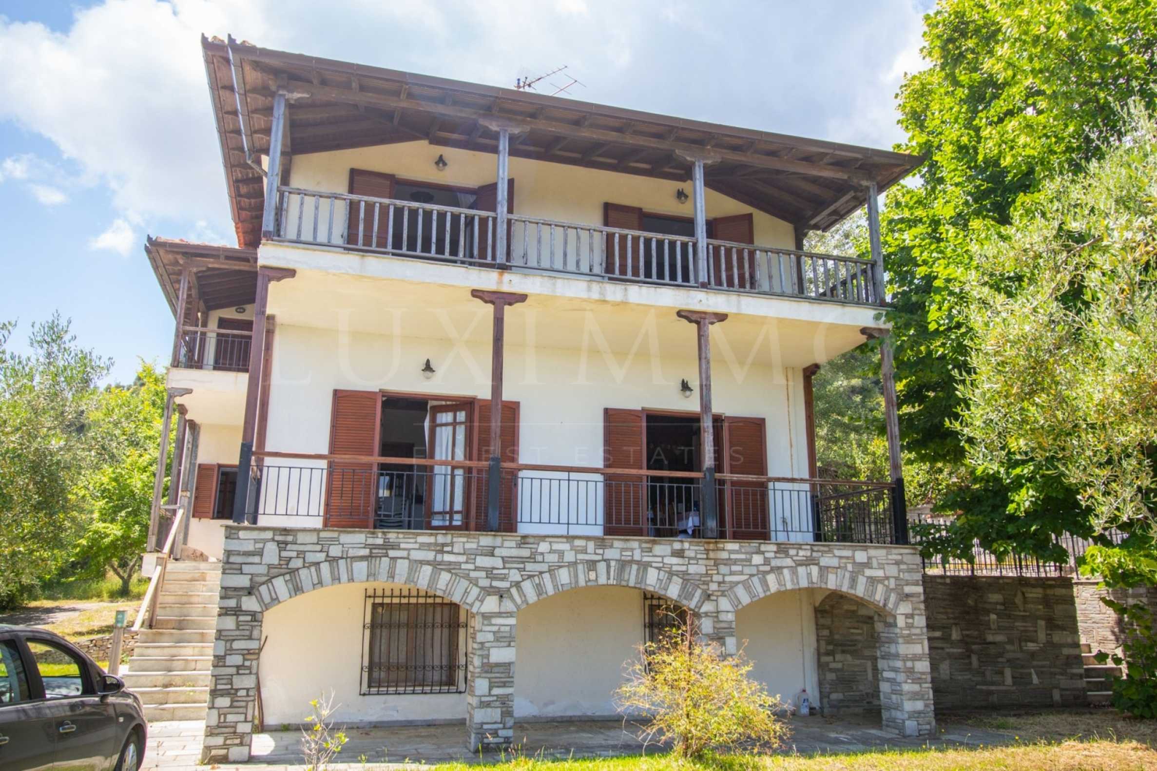 Excellent, bright detached house,300 m²,in Kassandra, Halkidiki. It is outside the village, with a southeastern orientation, very close to the sea. It is 150 meters away from the beach and 600 meters away from the center of the village. It is in an extremely good condition, furnished with fitted closets and all the electrical appliances. It has parking, autonomous heating system, fireplace, wooden joinery and a wonderful private garden of 4.150 m², in which there is also a large olive grove. It is split in three levels,100 m² each one of them, consisted of two living rooms connected with the kitchens, seven bedrooms, two bathrooms and two storage rooms.