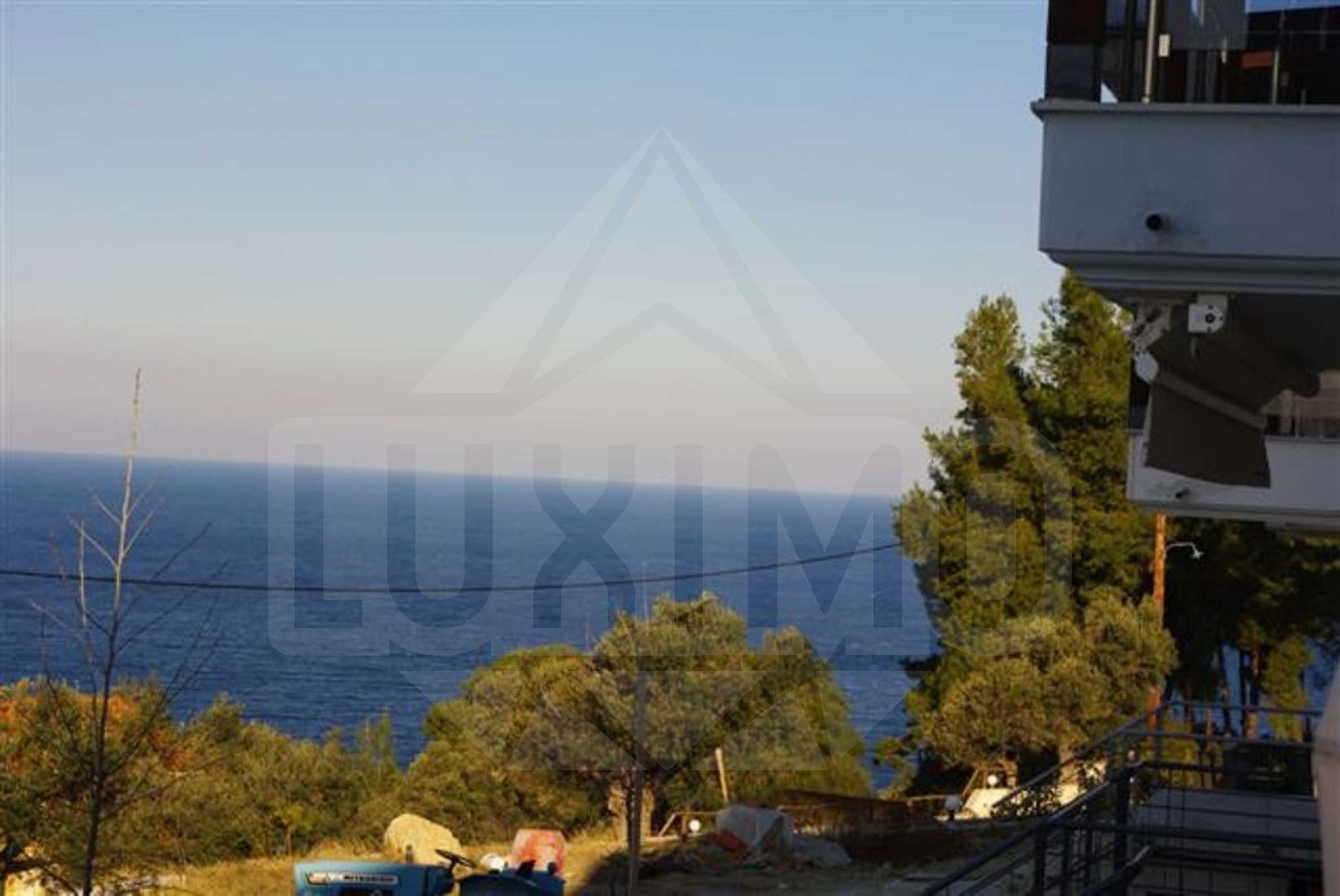 Luxurious maisonette in Kassandra, Halkidiki, 170 m2, with a large garden, parking spots, fireplace, unobstructed view to the sea, very close to the beach. It has four bedrooms and three bathrooms.