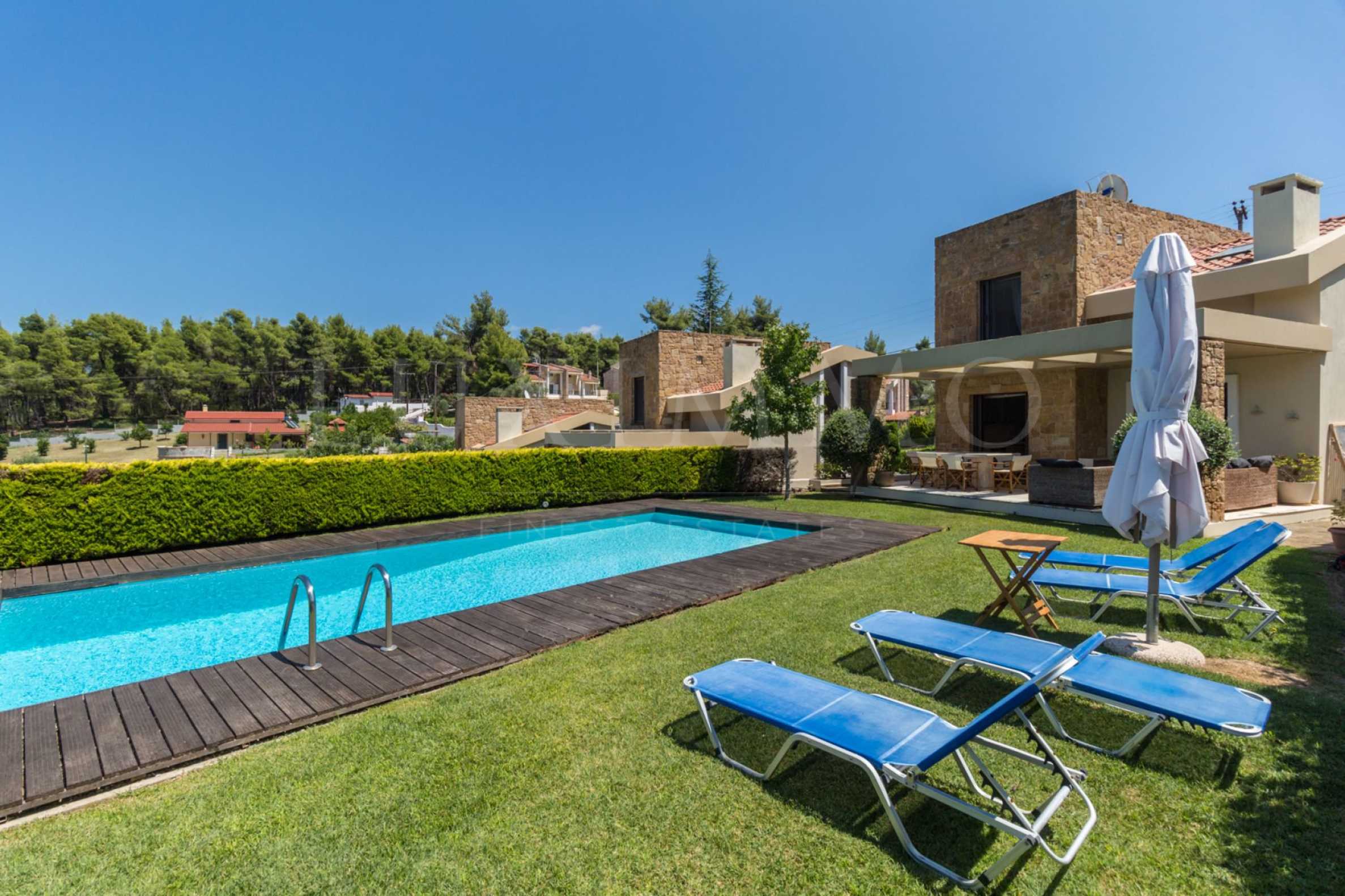 Luxurious maisonette,135 m,in Kassandra,Halkidiki with unobstructed permanent view and with an eastern orientation.The property is 1,2 km. away from a magical,organised beach and 1,8 km. away from the center of the village.The maisonette is split in three levels,consisted of a living room connected with the kitchen,four bedrooms,three bathrooms and a storage room.The property, also, has private,outdoor pool,two parking spots,400m garden,boiler,big balconies,stone floors,aluminum joinery and a security door.The maisonette is fully equipped and furnished.