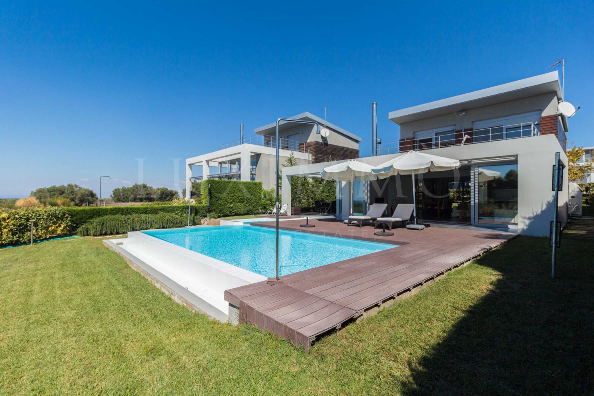 Beautiful,luxurious detached house,140 m,in Kassandra,Halkidiki with an eastern orientation and with unobstructed permanent view.The property is 1.7 km. away from the beach and the center of the village.The house is split in two levels,consisted of a living room connected with the kitchen,three bedrooms,two bathrooms and two storage rooms.The property,also,has big balconies,PVC joinery,private pool,680m garden,barbecue and alarm system pre-installation.The house is fully equipped and furnished.