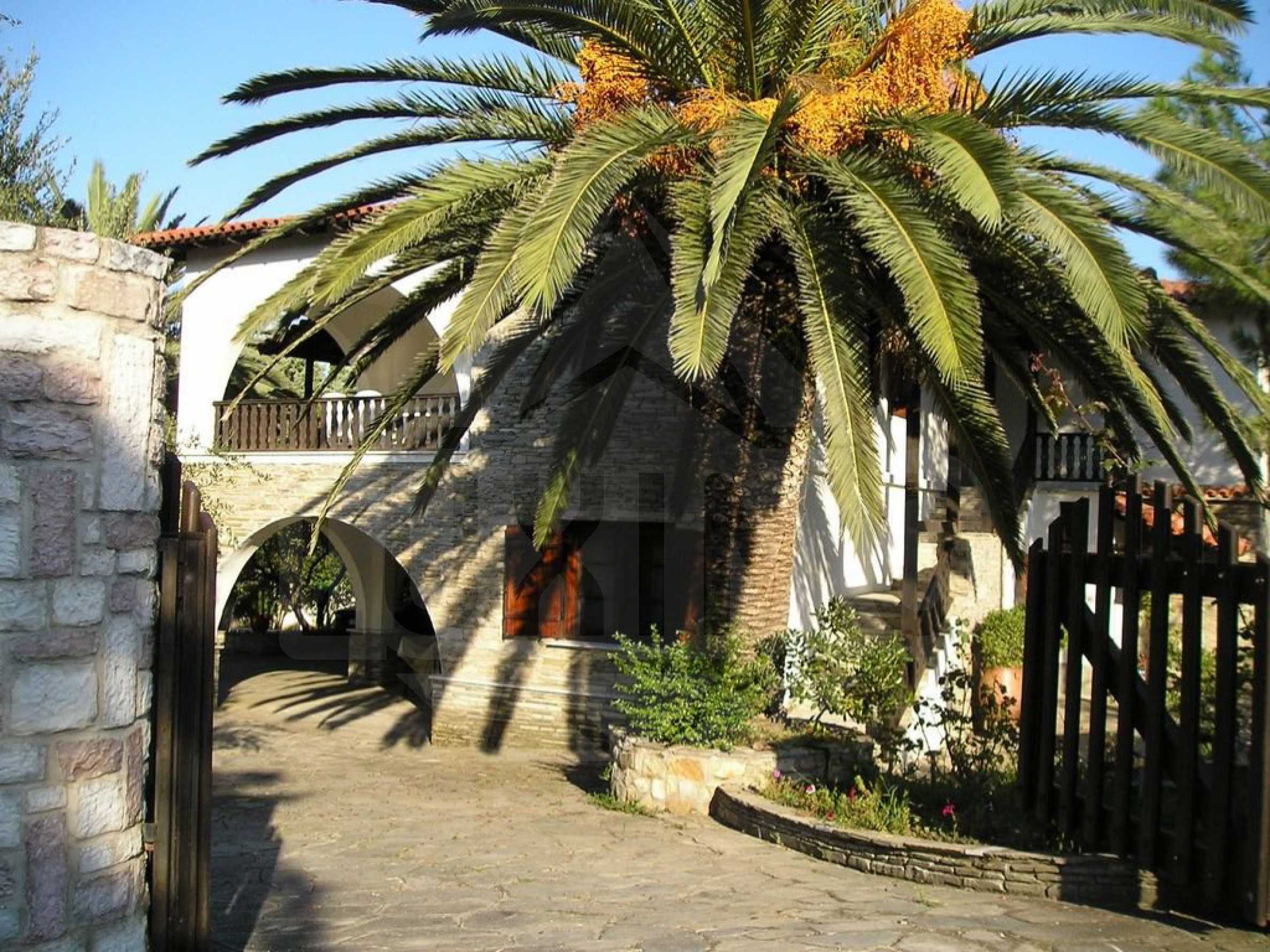 Unique villa in Sithonia, Halkidiki, in front of the sea. It is stone built, on a plot of 2.8 acres. The house is two storey and there is the potential to be split in two separate houses. The house has a living room, kitchen, two bedrooms and a bathroom on each floor. Furthermore there is central heating, air conditioning in all the rooms, alarm system, fitted closets and wooden window frames. It is furnished, luxuriously constructed and the garden has 150 trees such as palm trees, orange, lemon and tangerin trees and olive trees. There is automated watering and a well.
