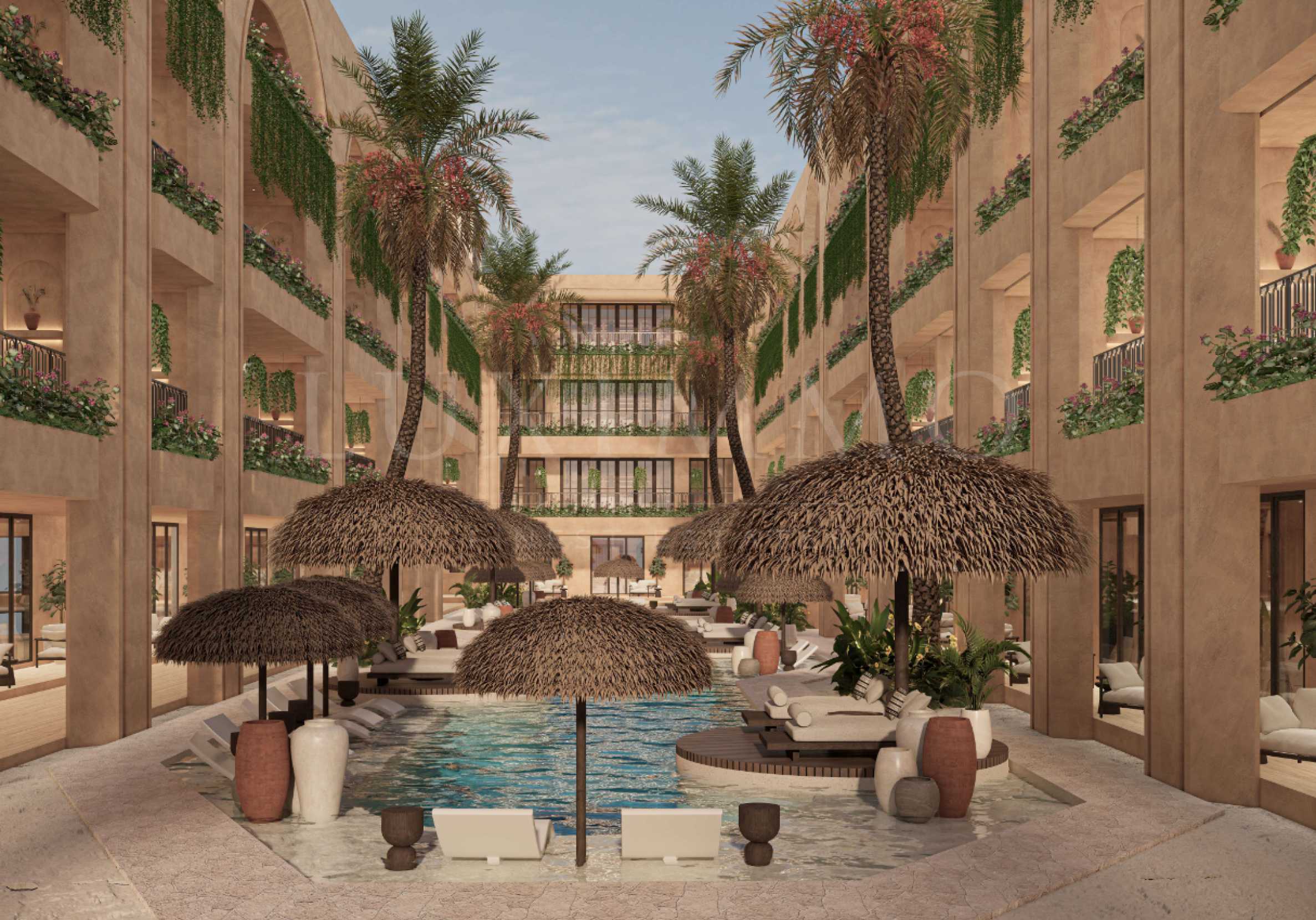 The apartments are offered fully furnished and equipped, featuring natural materials for flooring, high-quality appliances, and stylish furniture that together create a harmonious and elegant living environment. The layouts are comfortable and functional, while floor-to-ceiling windows and high ceilings enhance the sense of openness and space. Each residential unit includes a sun-drenched terrace, with the one- and two-bedroom apartments also featuring private swimming pools.