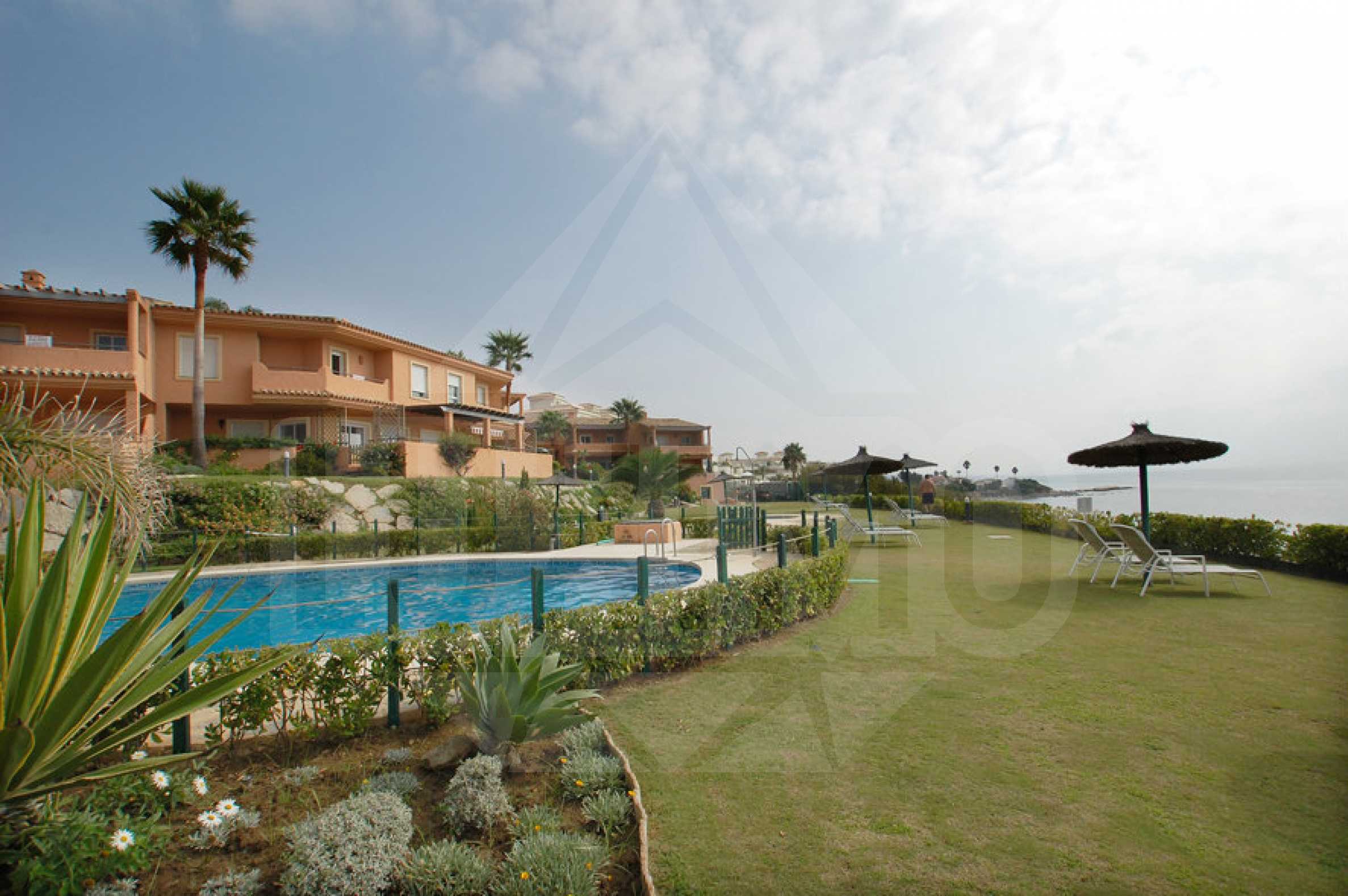 Frontline beach townhouse, west of Estepona. Southwest facing with beautiful views to the sea. Living/dining area with open plan kitchen and direct access to a nice covered and uncovered terrace, guest toilet, laundry area and 3 bedrooms and 2 bathrooms and a terrace upstairs. Parking space in front of the house. Small urbanisation with community pool and nice mature gardens. Direct access to the beach. Not far away from all amenities and golf. Appr. 5 minutes to Estepona Port. Furniture negotiable.Ideal holiday home with rental potential.