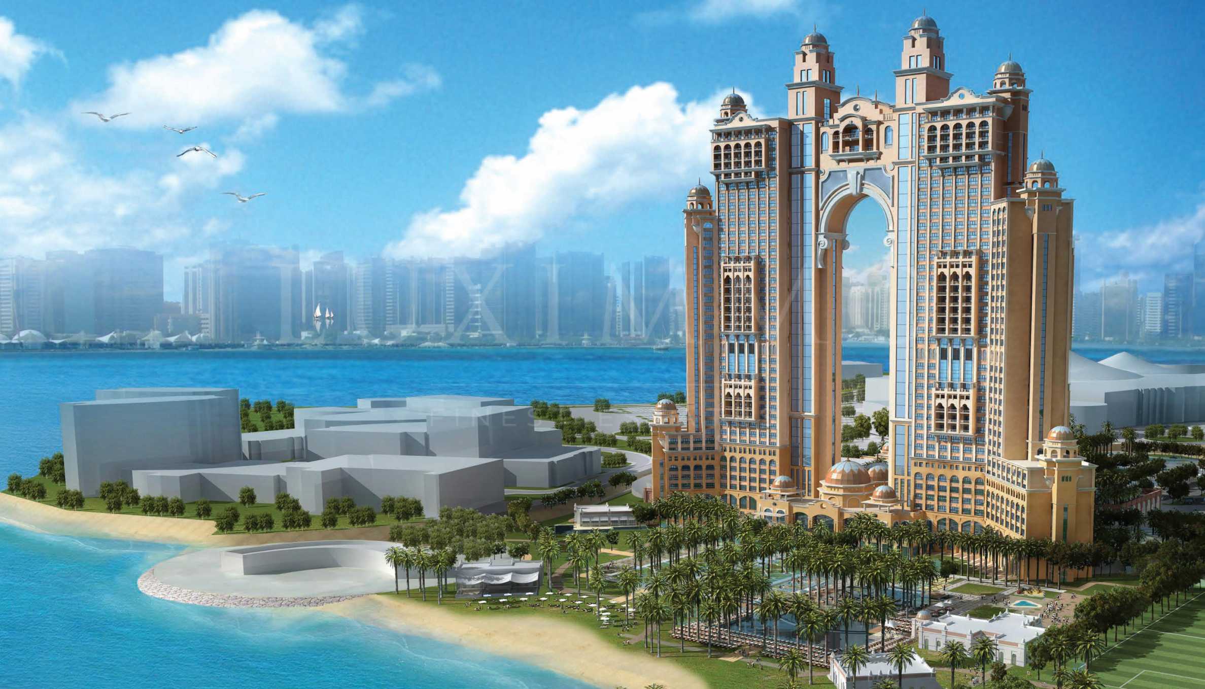 Located on the waterfront, the project is the tallest building on the island and has become one of the iconic facilities of the area, thanks to its exceptional architecture that combines Arabic traditions and postmodernism. The complex consists of two elegant 39-story towers in an oriental style, connected at the top by an arch, also called the Gold Lounge. One of the towers is home to the 5-star Fairmont Hotels & Resorts, while the second tower facilities 1-3 bedroom private residences.