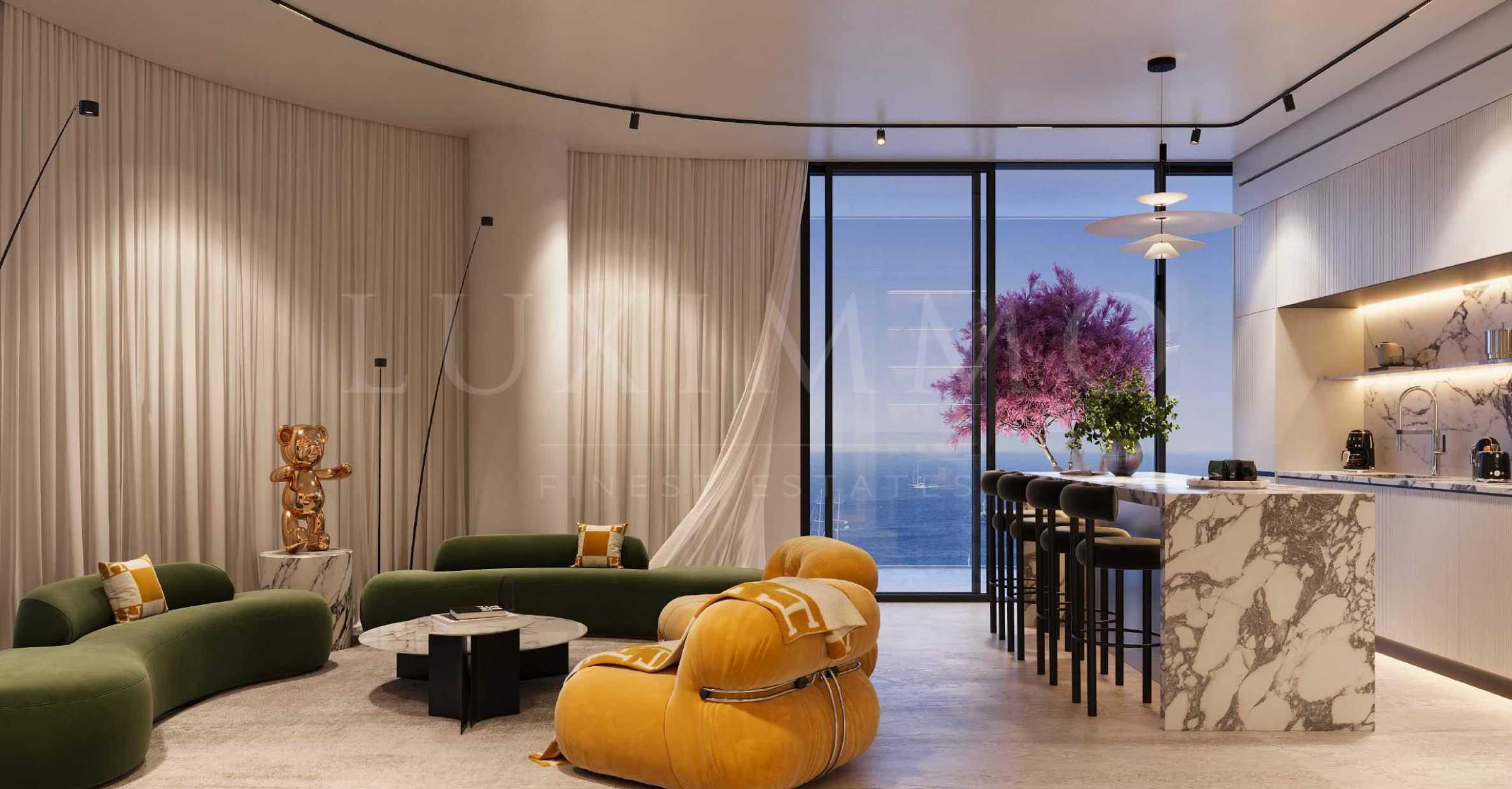 The apartment we have chosen to present to you is located on the third floor of the residential building and has a total area of 123.09 sq m. The layout includes a spacious living room with kitchen and dining area, a master bedroom with en-suite bathroom and dressing room, an additional bedroom with en-suite bathroom and a sunny terrace. The high ceilings and floor-to-ceiling windows reveal panoramic views that envelop you with their beauty – mornings begin with the calm rhythm of the sea waves, and evenings end with the charm of the shining city skyline.