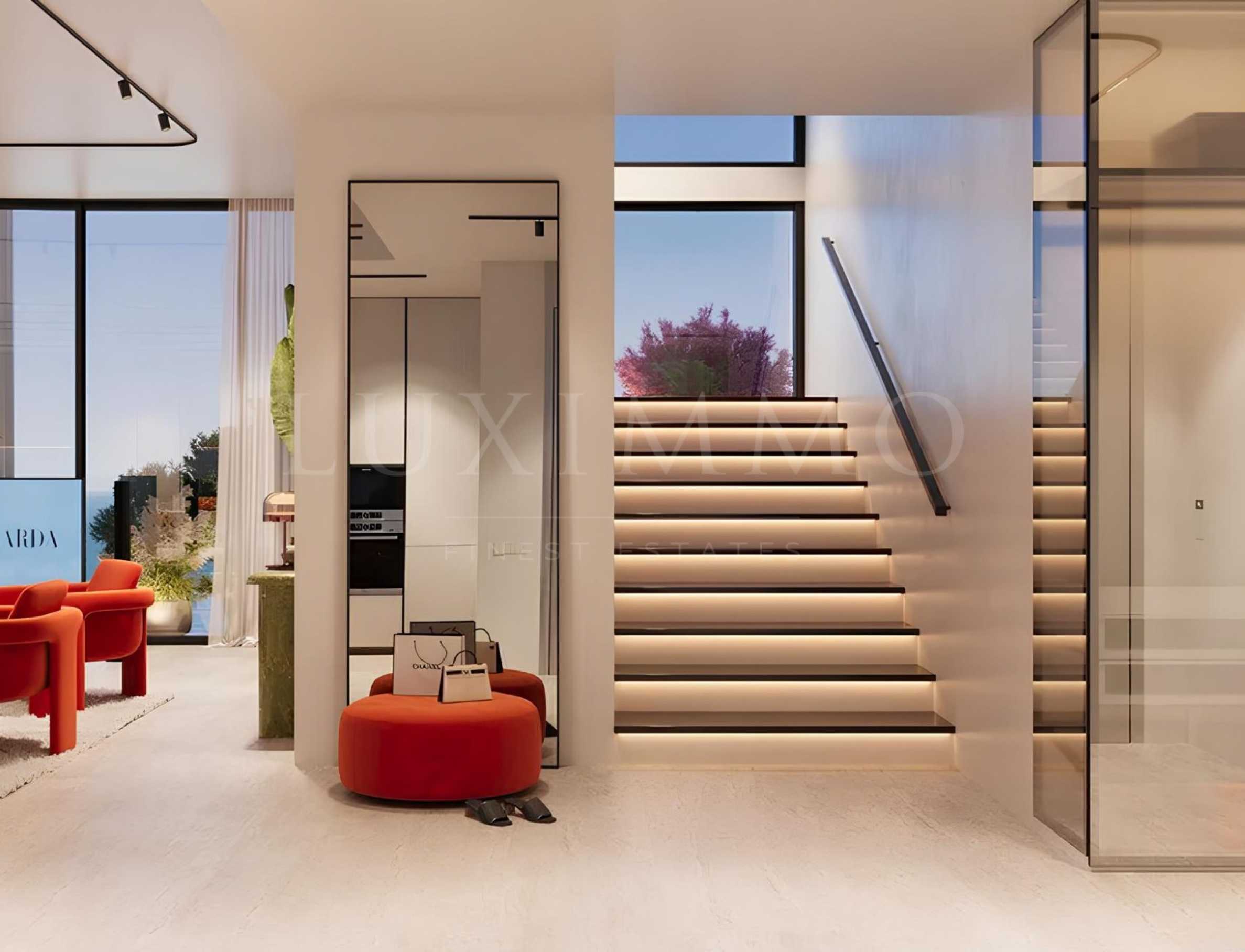 We present to you a two-bedroom apartment, located on the second and third floors of the building, from where stunning views of both the sea and the island are revealed. With a total area of 196.14 sq m, the apartment includes a spacious living room with kitchen and dining area, two bedrooms with en-suite bathrooms, a guest toilet and two large balconies. The high ceilings and floor-to-ceiling windows give a feeling of spaciousness and airiness. The apartment is offered fully furnished and equipped, with every detail carefully selected to ensure maximum comfort for its future residents.