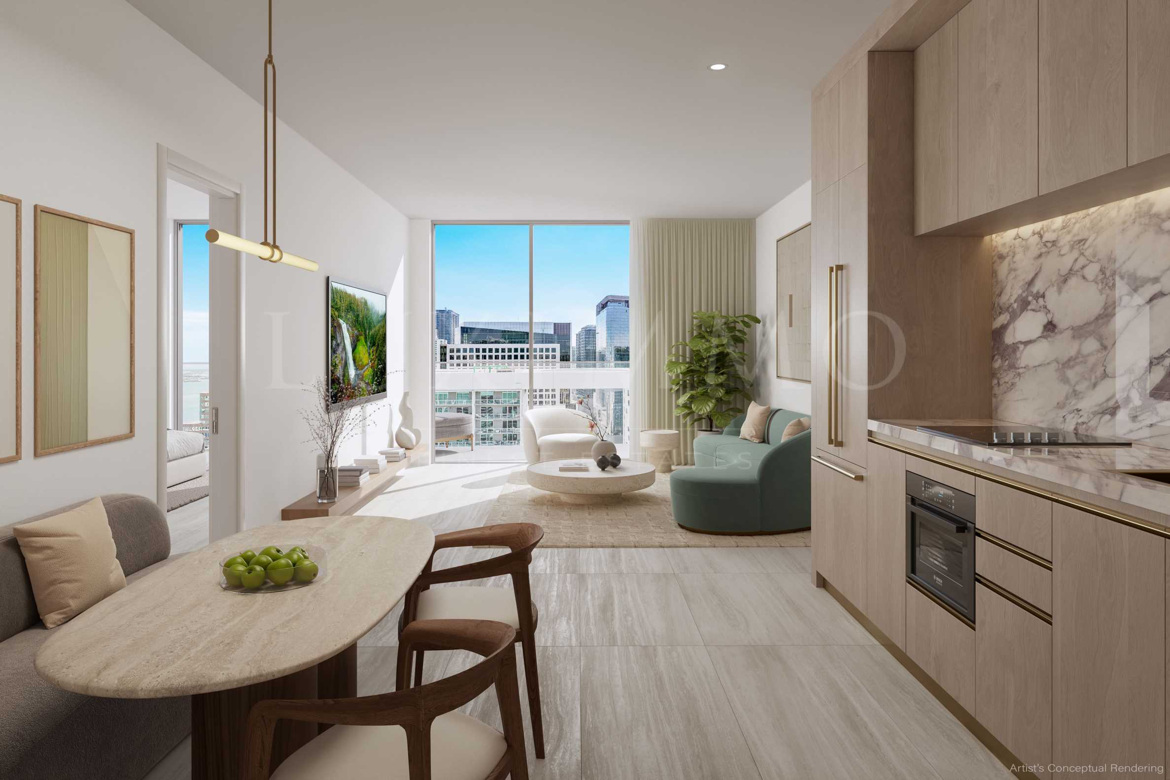 Most residences feature convenient walk-in closets in the bedrooms, and all apartments have direct access to the terrace from both the living room and bedroom, providing a connection to the impressive views and fresh air of Miami.