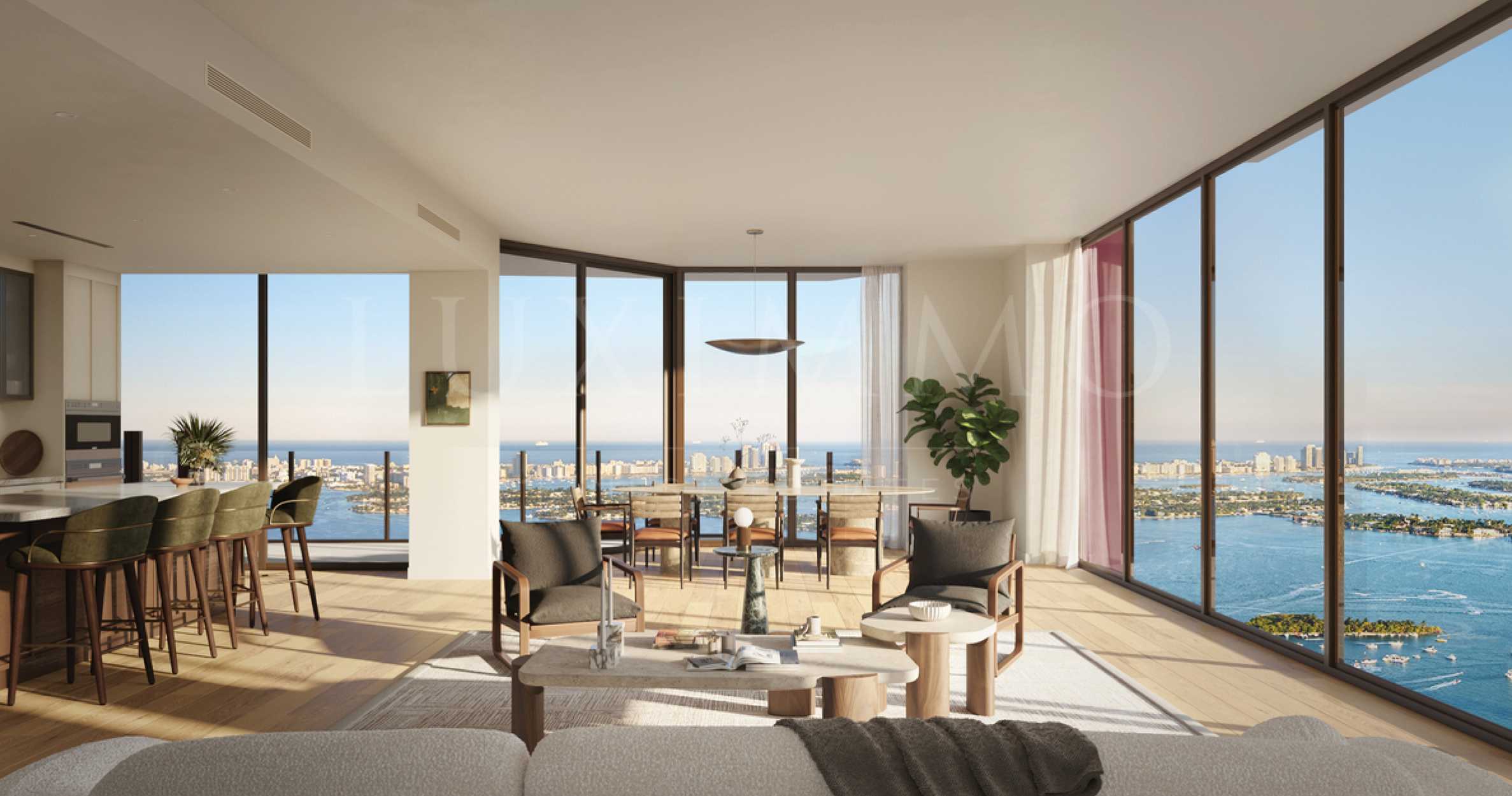 We have chosen to present you an impressive apartment, called Villa Mezzo, which occupies half a floor of the building and impresses with its area of 312.80 sq m. The residence has high ceilings and is surrounded by floor-to-ceiling windows that reveal incredible views of Biscayne Bay. Thanks to the careful design and mixed exposure, sunlight enters the premises at every hour of the day. The layout of the property includes a spacious living room with kitchen and dining room, three bedrooms with en-suite bathrooms, an additional room that you can furnish and equip according to your choice, two balconies and a guest toilet.